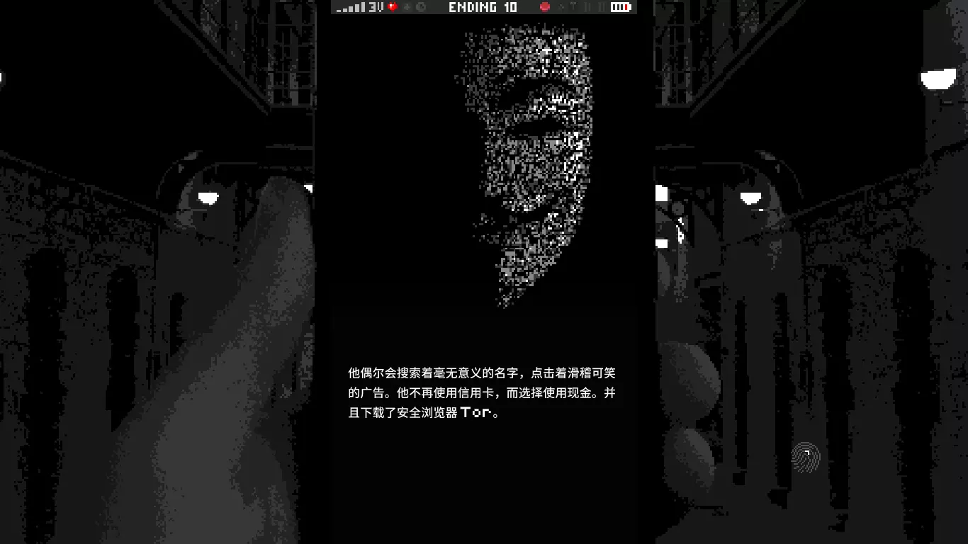 他偶尔会搜索着毫无意义的名字,点击着滑稽可笑的广告。他不再使用信用卡,而选择使用现金。并且下载了安全浏览器【洋葱浏览器】。 副本, 副本, 你不过是一个副本。 Ending 11