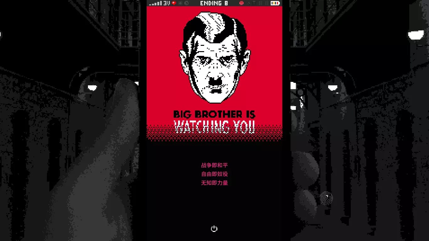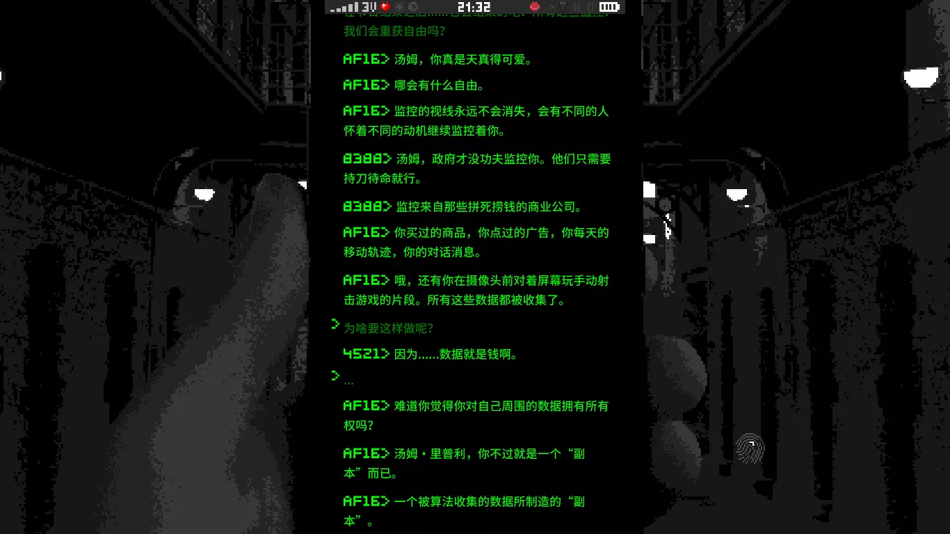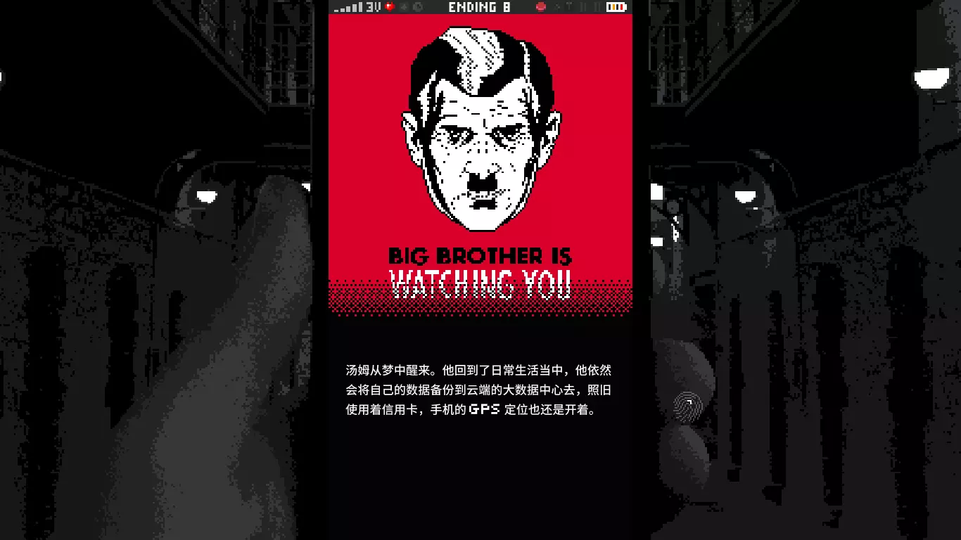 汤姆从梦中醒来,他回到了日常生活当中,他依然会将自己的数据备份到云端的大数据中心去,照旧使用着信用卡,手机的GPS定位也还是开着。 引用自乔治·奥威尔《1984》:战争即和平, 自由即奴役, 无知即力量。 结局9