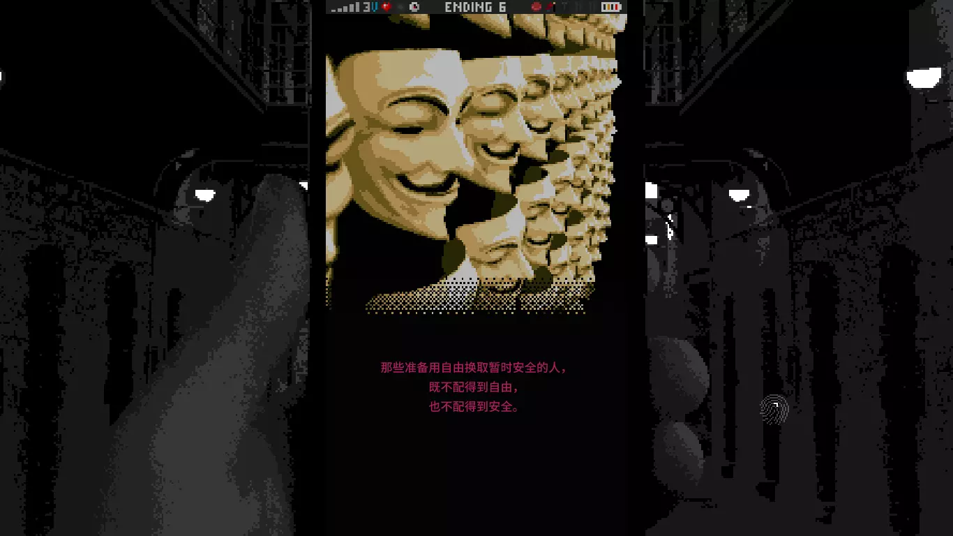国土安全局再也不会窥探个人手机了,他们缺乏调查放屁手机的幽默感。 (11月5日也是《V字仇杀队》中暴动的日子) 引用自 本杰明·富兰克林:那些准备用自由换取暂时安全的人, 既不配得到自由, 也不配得到安全。 结局7