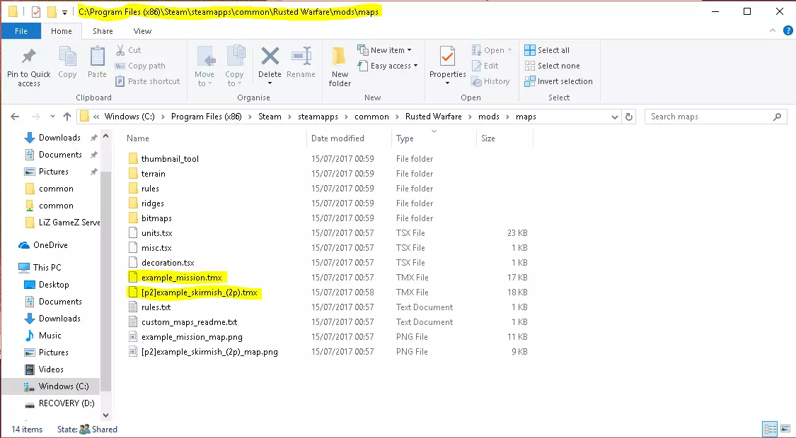 下载程序后,将其解压或安装到任意位置,然后启动程序! 打开示例地图 为了完成基础指南,我们将打开游戏自带的示例地图。 导航至你的游戏文件夹:C: Program Files (x86) Steam steamapps common Rusted Warfare 现在打开【mods】文件夹,然后打开【maps】,你会看到许多文件。 据我所知,这些文件大多是重要资源和现成的项目设置,供Tiled识别并方便开始编辑《铁锈战争》的地图。 扩展名为【.tmx】的文件是你的地图文件,可以直接在游戏中启动。