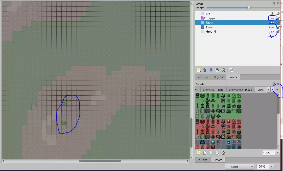 上图中标注部分的说明如下: 1. 图层:在这里可以设置特定图层的可见性,以便轻松编辑地图的某些方面,例如:只显示地图纹理或编辑出生点。 2. 图块:这些基本上就是你的纹理,单位、出生点和资源也可以在这里找到(右上角的下拉箭头)。 3. 你的地图:这是根据你选择的可见图层所显示的内容,也是你进行所有修改的地方。 放置单位: 在此示例中,我将简单地为自己的队伍添加一些预生成单位。 因此,如果你点击图块集右上角的下拉箭头并选择“单位”,就可以开始放置单位了,我建议除了“设置”和“单位”图层外,隐藏其他图层,操作如下: