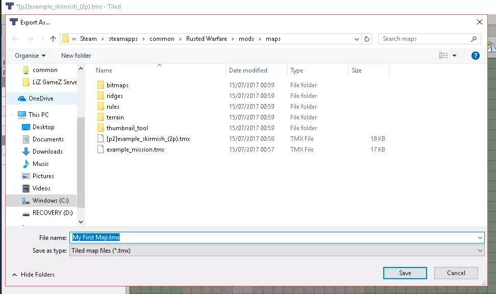 当然,你可以从单位板块添加更多队伍,甚至可以让军队提前生成并观看战斗!你应该明白了!编辑地图设计也非常类似,只需隐藏单位和物品图层,然后选择你想要放置的纹理。 保存地图 现在保存我们的更改并进行测试! 在编辑器中,只需前往文件->导出为...,为文件命名并保存在以下文件夹中: C: Program Files (x86) Steam steamapps common Rusted Warfare mods maps 我将把我的地图命名为“我的第一张地图”。
