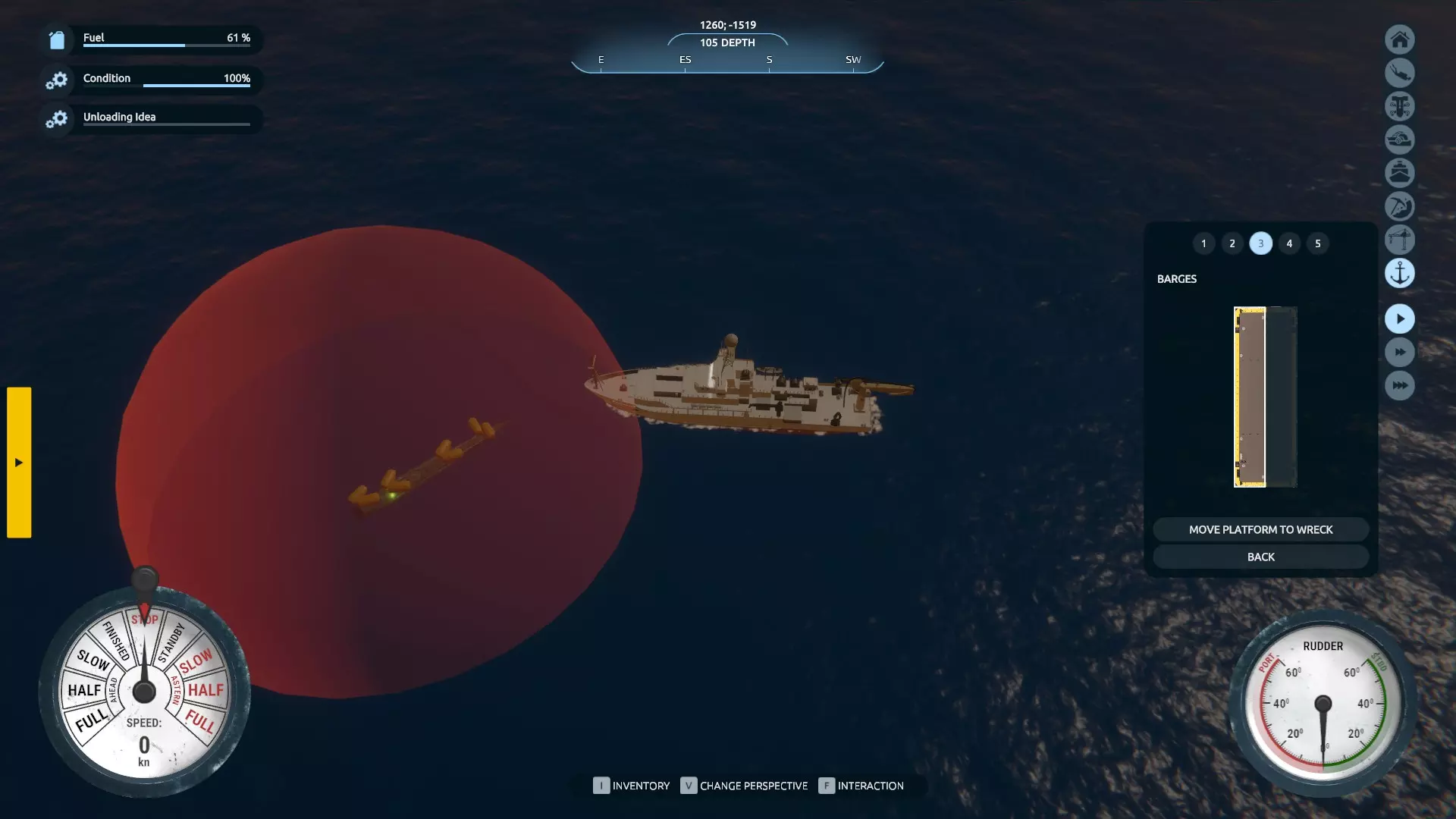 我的船就停泊在沉船正上方,潜艇的船尾像长矛一样猛地向上翘起,径直撞向船的左舷。谢天谢地,当它冲出水面时并没有造成任何影响。 现在,回到水面并登上你的船。选择船舵切换到第三人称视角,然后点击屏幕右侧的【打捞起重】按钮。此时会提示你“打电话”,你可以选择【租借大型驳船】。之后会显示驳船的示意图,点击该图,然后选择【开始打捞】按钮。 这里可能会出现一个起初让我非常困惑的情况——如果你的船离沉船太近,就会出现一个红色的区域。这只是意味着你需要把你的探险船稍微移开一点……