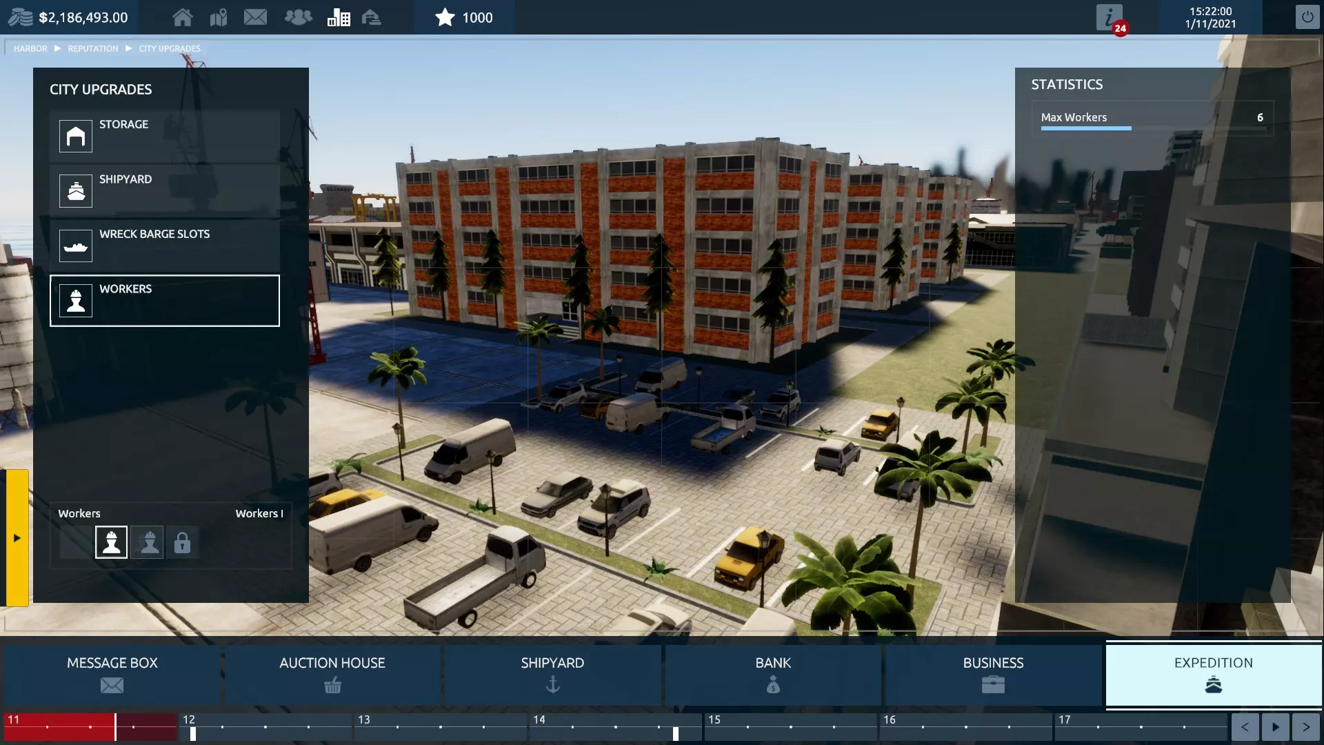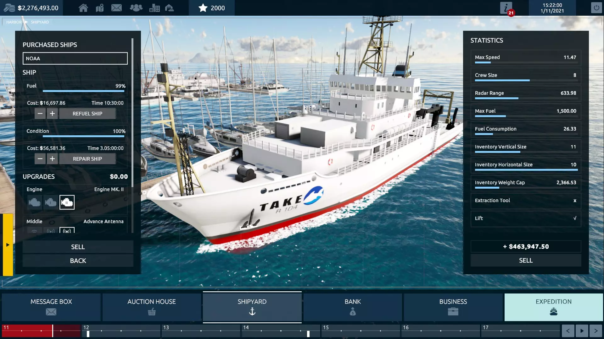 工人升级能让你雇佣足够的船员来配备船只(我记得是四名)。 造船厂升级允许你购买第二艘船;这一点很重要,因为如果没有购买第二艘船的能力,你就无法出售你的基础船只来更换它。 现在你可以购买NOAA船只,并在其后方的升级区域配备一个起重机。