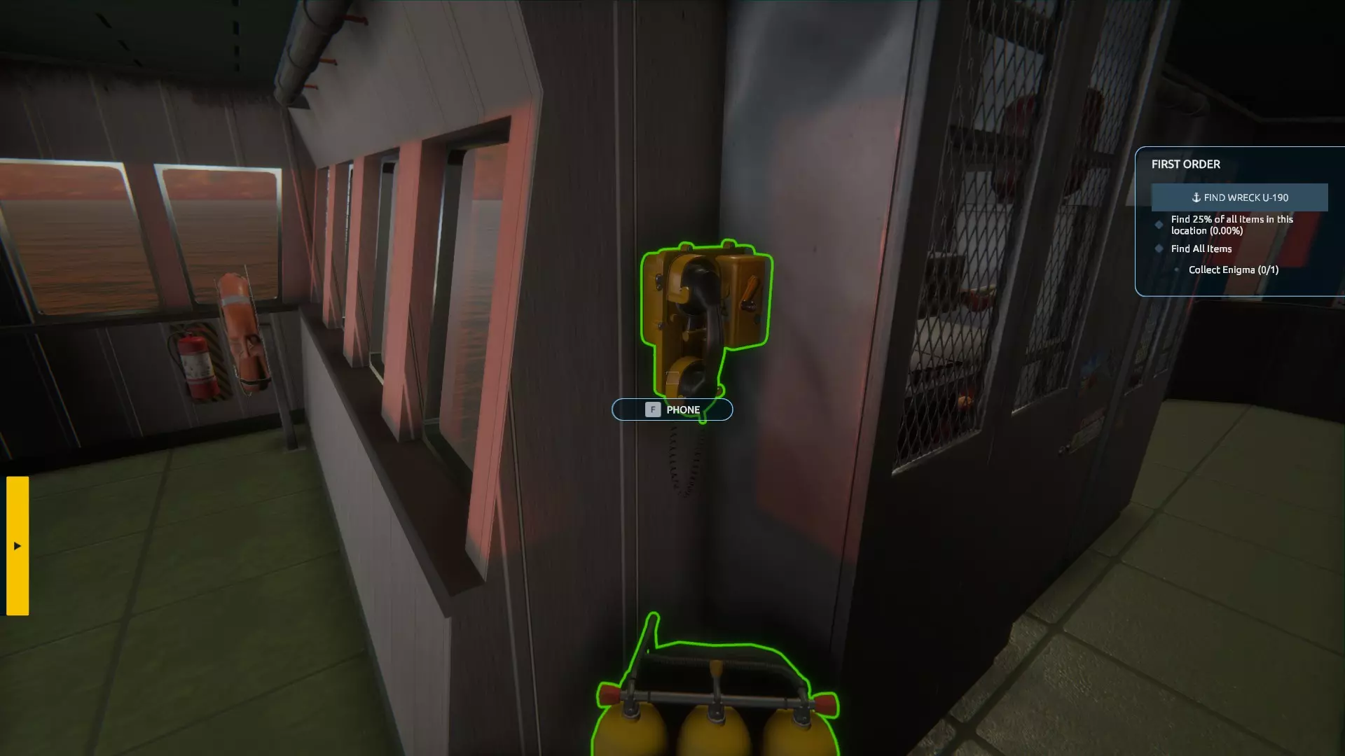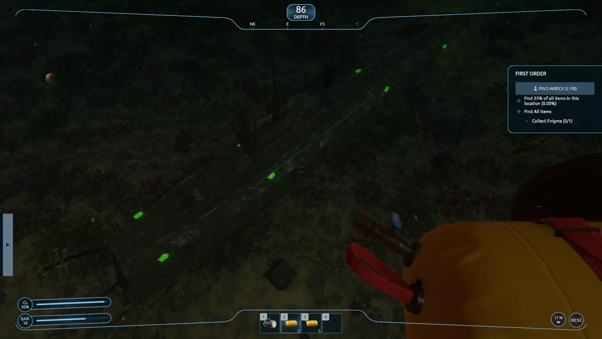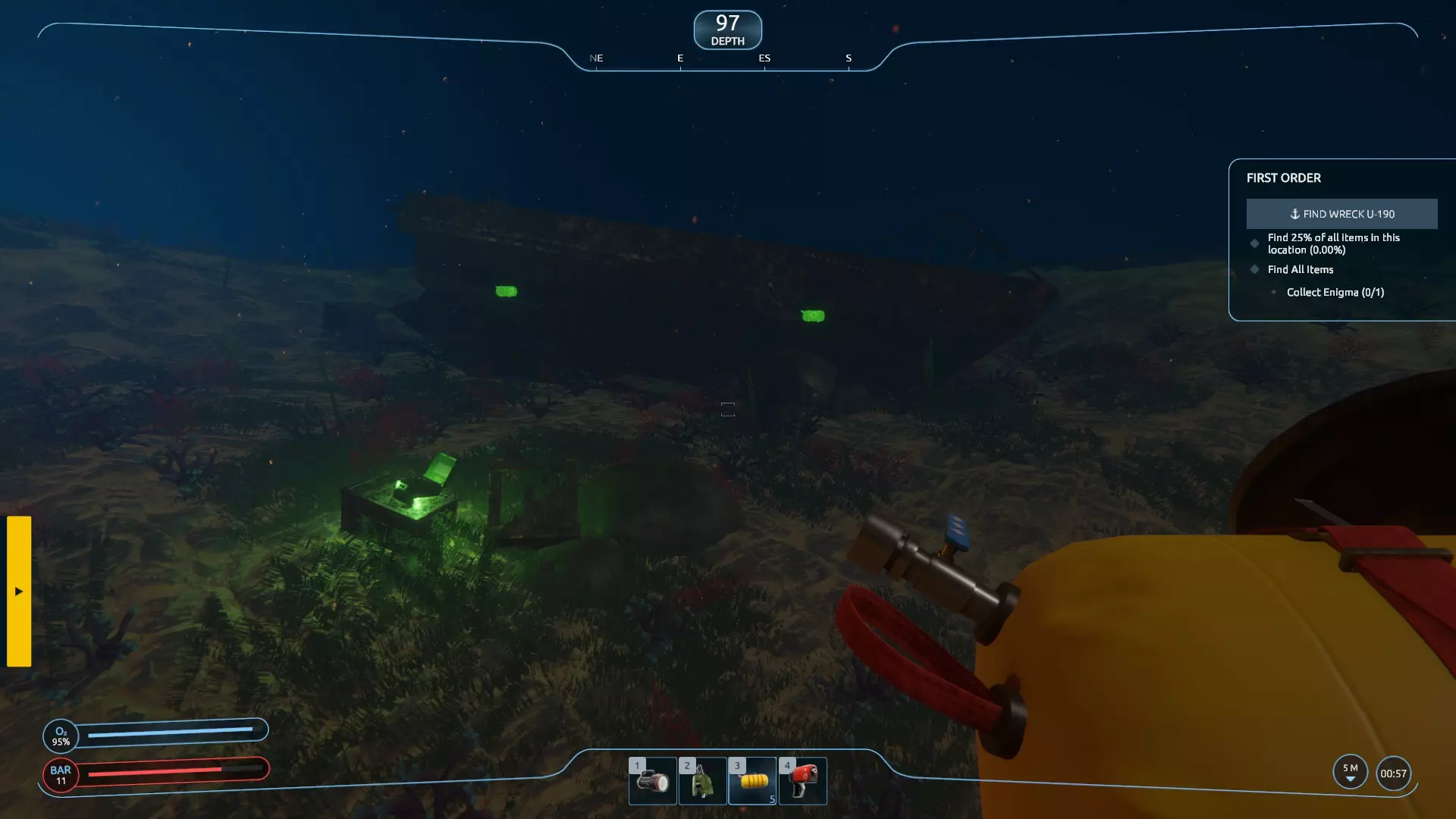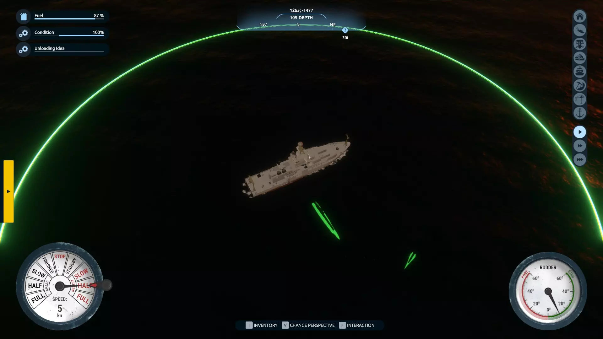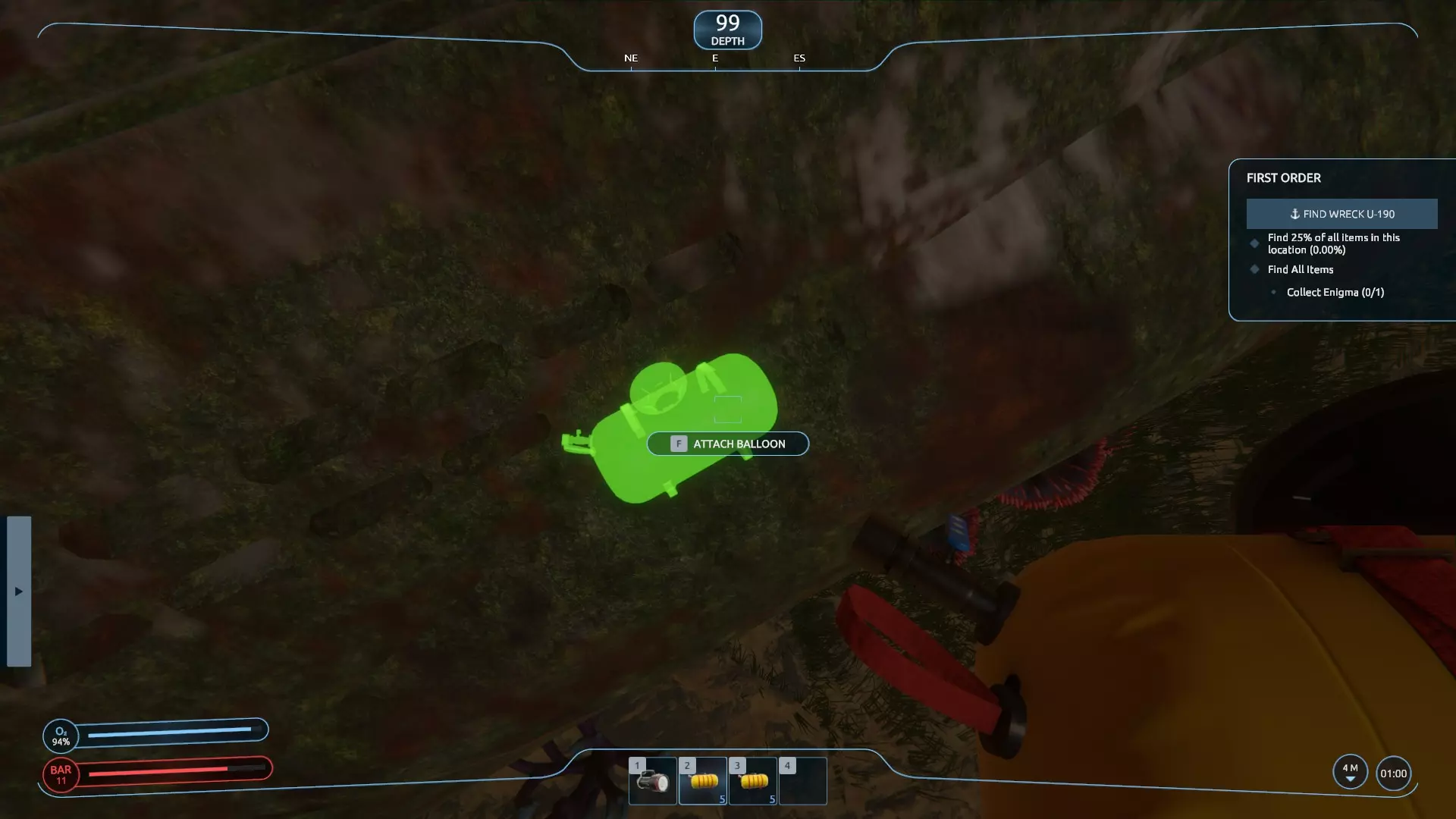 现在你可以通过选择舰桥上的储罐,或在舵轮处的第三人称视角中点击【下潜】按钮来下潜。当你找到U艇残骸时,可以在物品栏中装备并选择气球。你会注意到船体上出现了许多绿色的气球状物体。