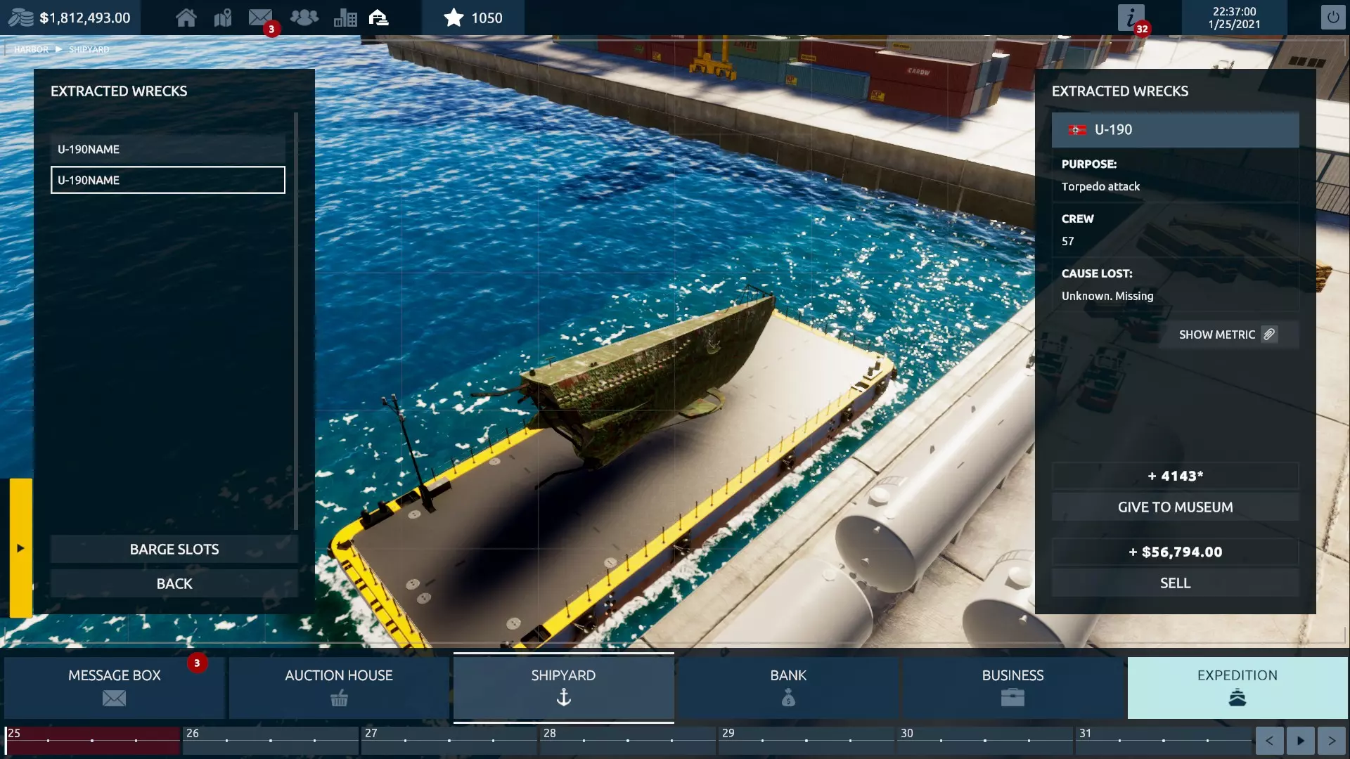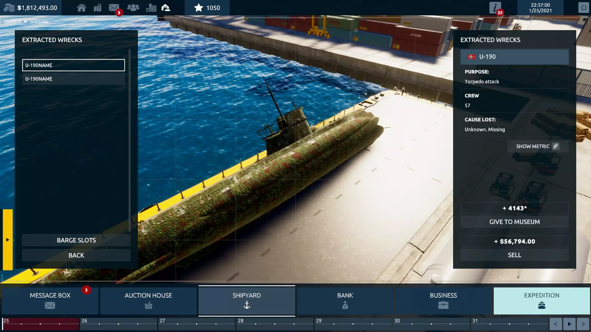 此时,你可以回到海底并完成任务——那里有文物可供收集,而【谜机】就放在海底断裂的船头部分附近的一个储物箱上。完成后,返回港口。 前往造船厂,现在你可以访问【已打捞残骸】标签页。在这里,你会看到你那艘可爱的U艇分成两段停在船坞里,这无疑是个不寻常的景象。游戏会给你选择:将残骸碎片出售换取金钱,或者捐赠给博物馆以获得大量【经验值】。以前,我只选择经验值,因为一艘二战U艇的售价低得可笑——不过,在补丁更新后,你或许可以考虑选择金钱了。