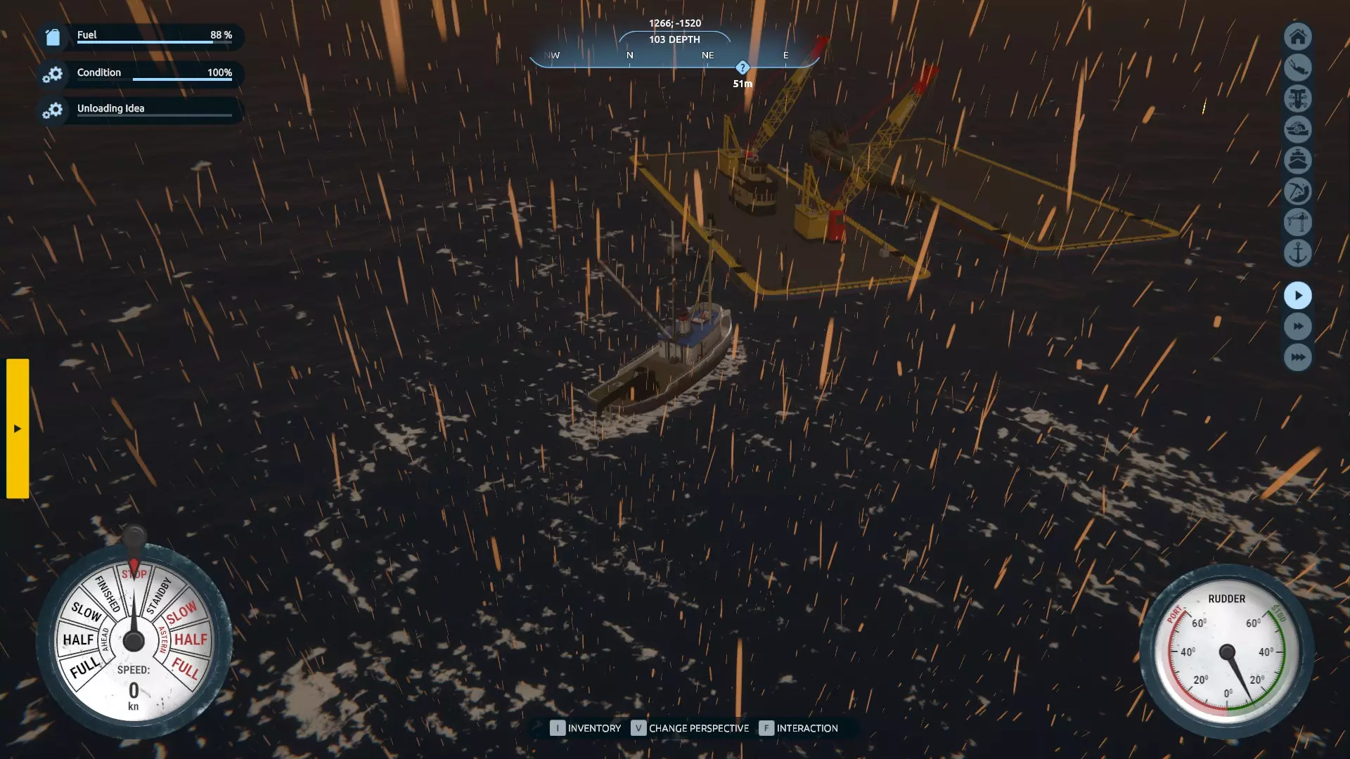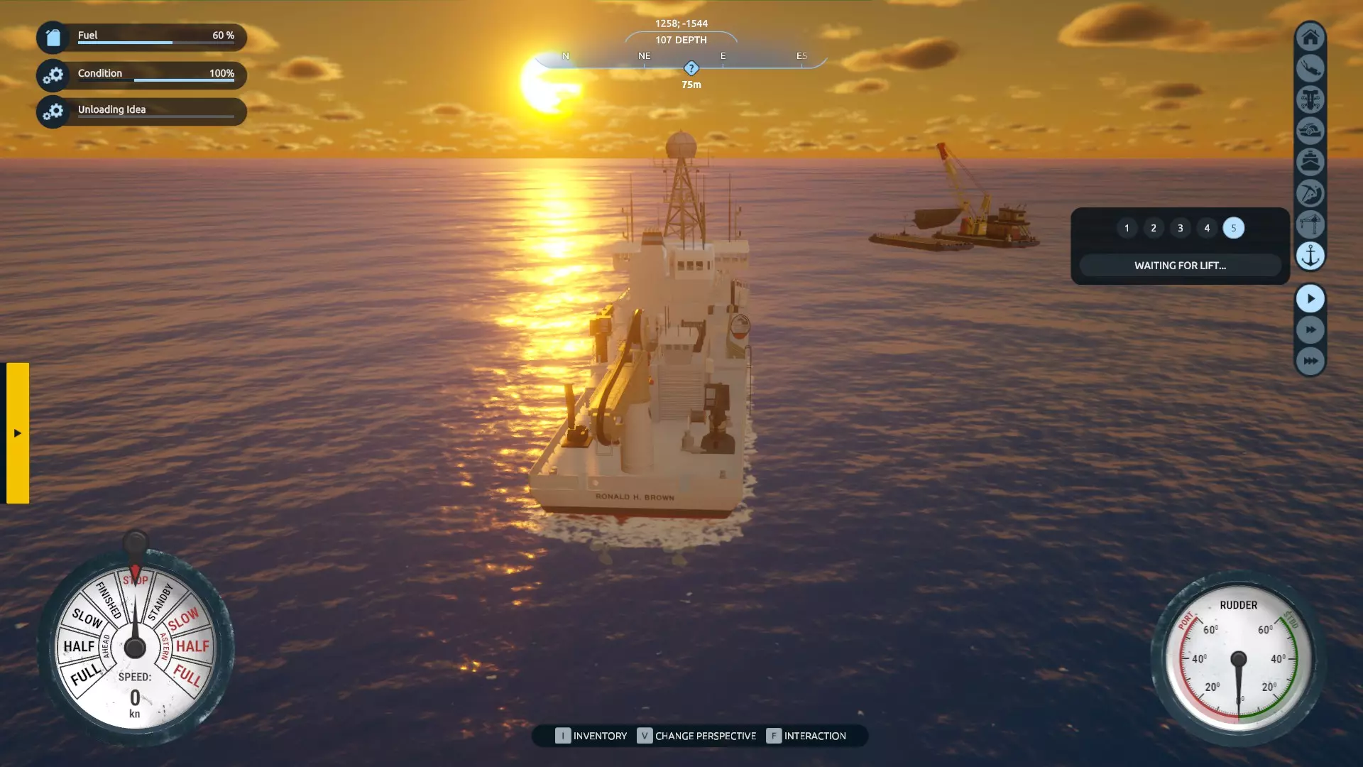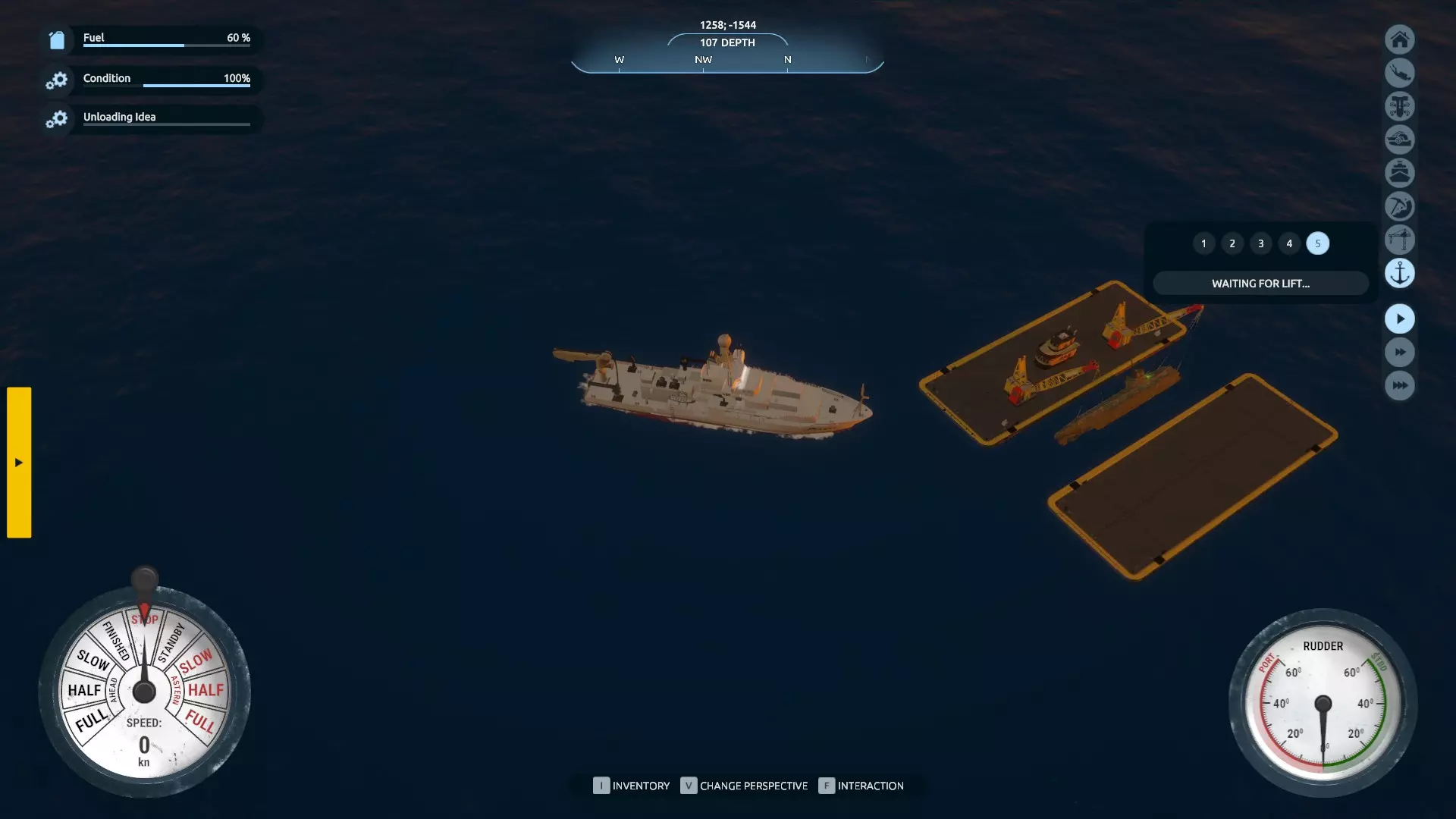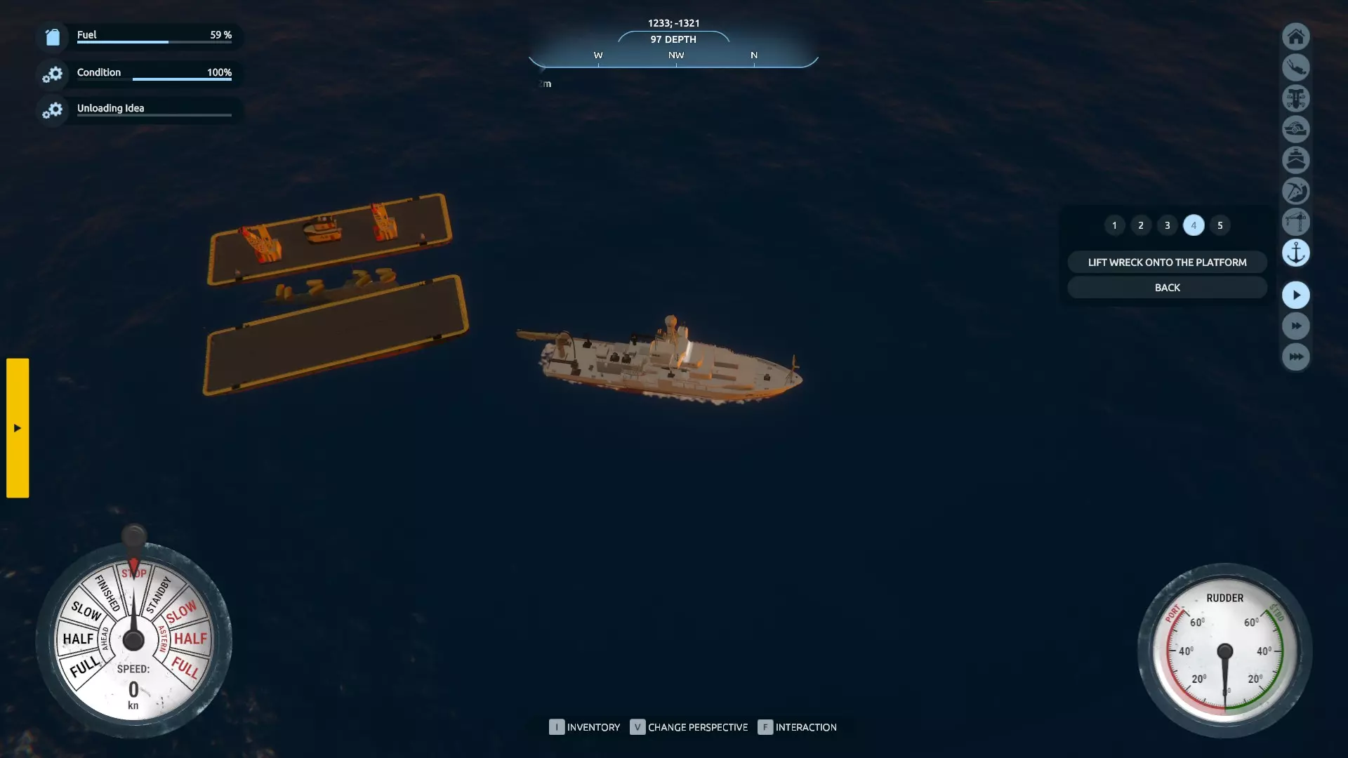 现在你知道该怎么做了:回到驾驶台,切换第三人称视角屏幕,然后从残骸吊升选项卡中呼叫小型驳船。重复将残骸移到驳船上的过程,完成后将其送回岸边。
