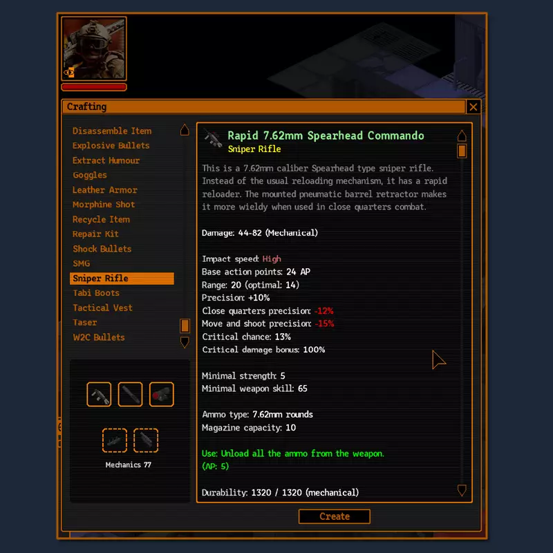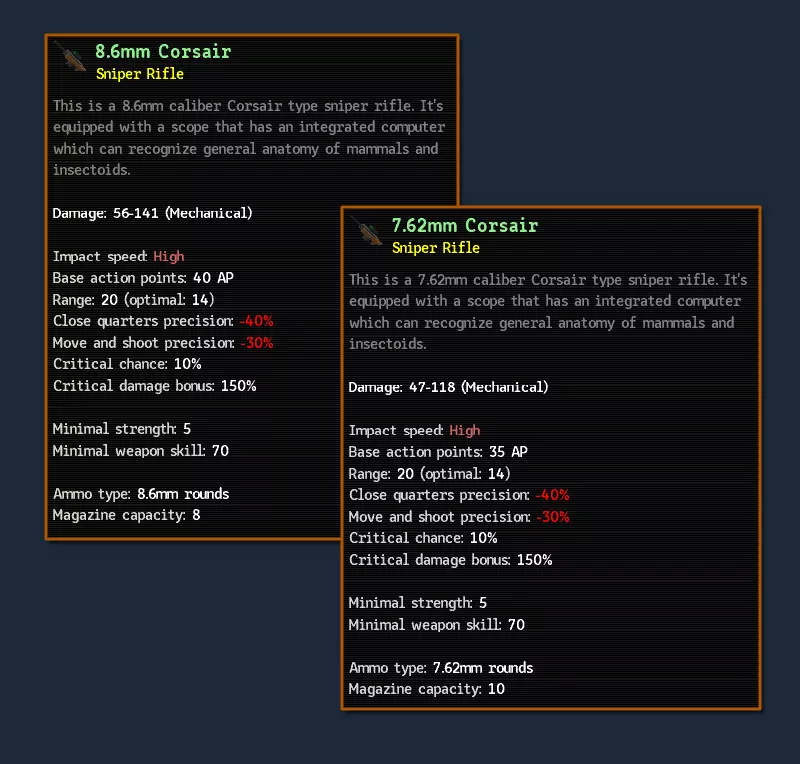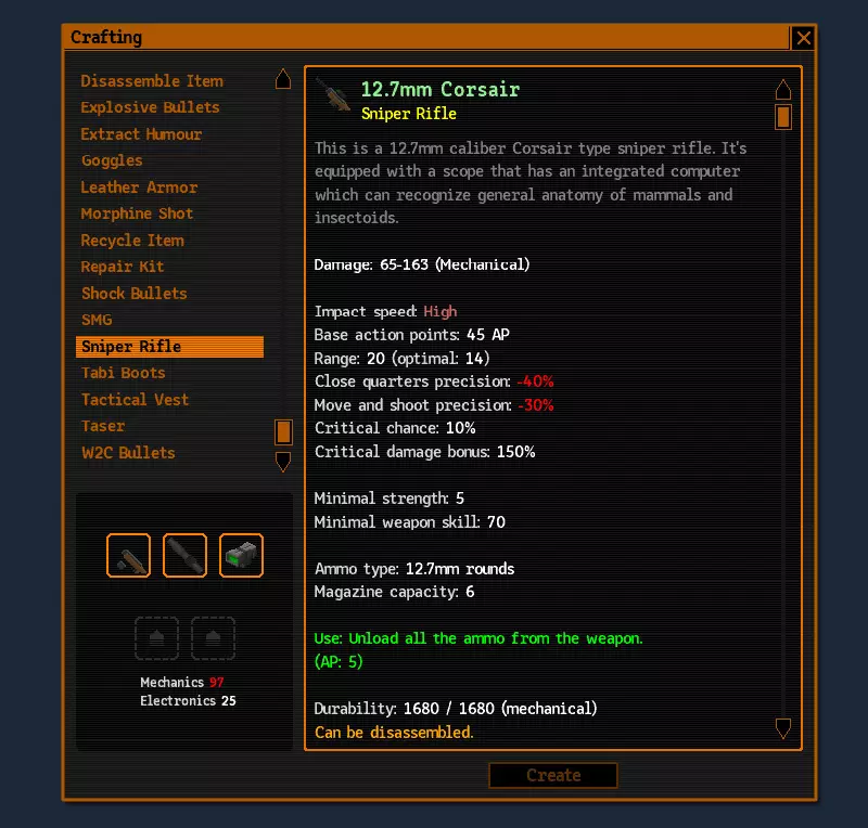 如你所见,伤害下降得不算太严重。不过,弹药更便宜也更常见。而且较小口径的子弹所需的行动点数也更少。7.62子弹消耗35点行动点——这已经相当不错了 :-) 附言:终于从布兰恩那里买到了制作一把好狙击枪的枪身(好歹有88的品质)。它的主要优点是射击只需24点行动点。这意味着在一回合中,通过技能可以射击两次——从隐蔽状态下射击和必定暴击射击。使用肾上腺素的话还能进行第三次射击。
