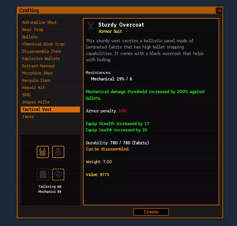 这是一把相当经济实惠的冲锋枪。它的配件提升效果不大,但瞄准镜是必不可少的。我还刷到了一个增加两发弹匣容量的配件。不过说实话,到12级为止我一次都没用过弹匣扩容,因为没必要(每次行动能射击3次),而且子弹也挺舍不得用的。用它打阿尔法鼠的暴击伤害能达到110点。 护甲和配件方面,在制作轻型护甲和带内衬的背心之间选择时,我选了背心。它能很好地防御小型机器人的子弹,而我们本来就没有闪避和规避能力:-)