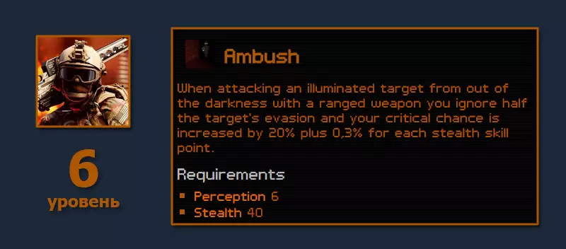 我们继续提升暴击率。100点隐蔽状态下的伏击能提供50%暴击率,加上15%的点数加成和7%的被动技能,这已经有72%了。如果用超级布料制作护甲,还能再增加10%。再配合专注药剂,就能接近100%暴击率。在这样的暴击率下,给武器安装智能模块就没什么意义了。 完成与戈尔什科夫的任务链后,我们就自由了。所有道路都已开放。可以去解决鼠王的问题,或者加入各个派系。或者直接前往学院。无论如何,我们已经为激烈的战斗做好了充分准备。面对隐形敌人,探测点数、照明弹和高感知属性将对我们有所帮助。下一个辅助被动技能: