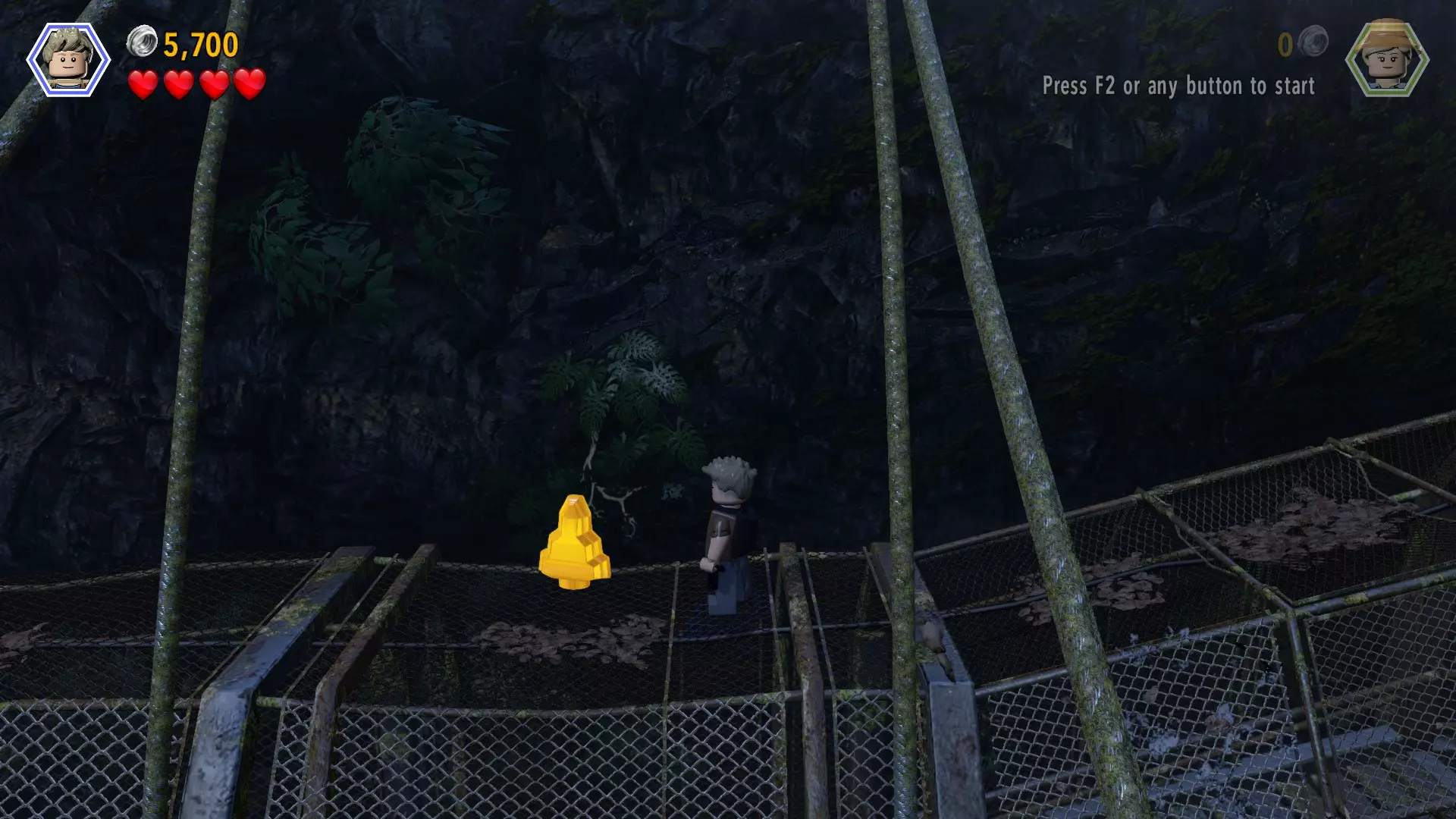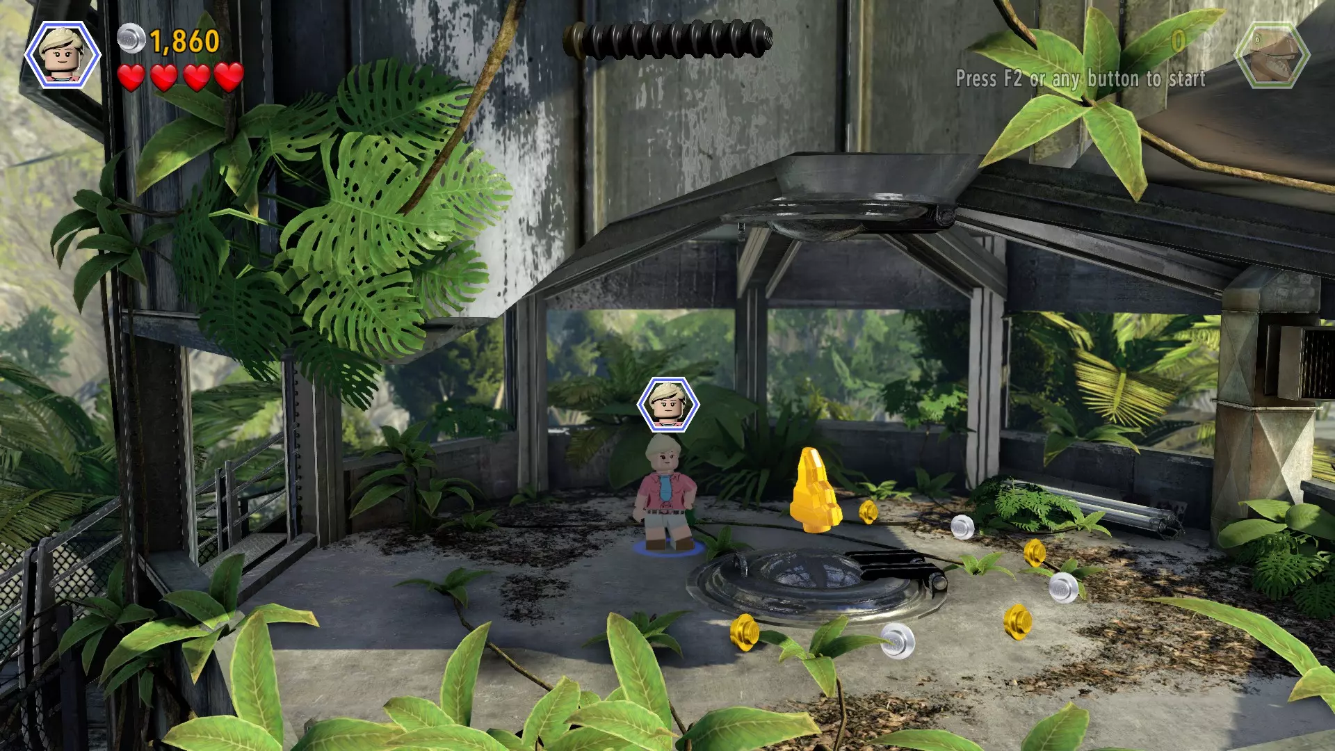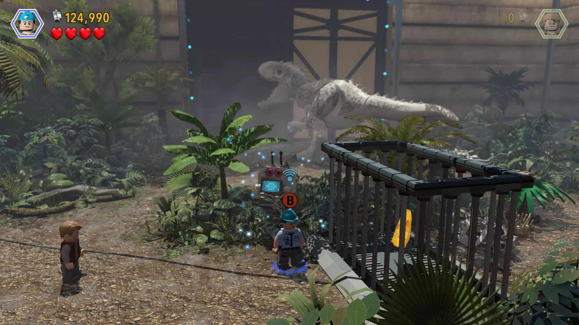 恐龙:棘龙 关卡:鸟笼(第二部分 - 翼龙巢穴) 所需角色:艾莉(带水壶)、攀爬者(比利或欧文) 位置:屋顶上方 方法:穿过右侧有围栏的通道,直到找到一个黄色箱子和一株可浇水的植物(故事模式中翼龙攻击的位置)。使用艾莉给植物浇水,它会生长出一个弹跳垫。利用弹跳垫到达 catwalk(高空走道)(这有点棘手但可以做到)。切换到攀爬角色,一直向左走,直到找到积木。