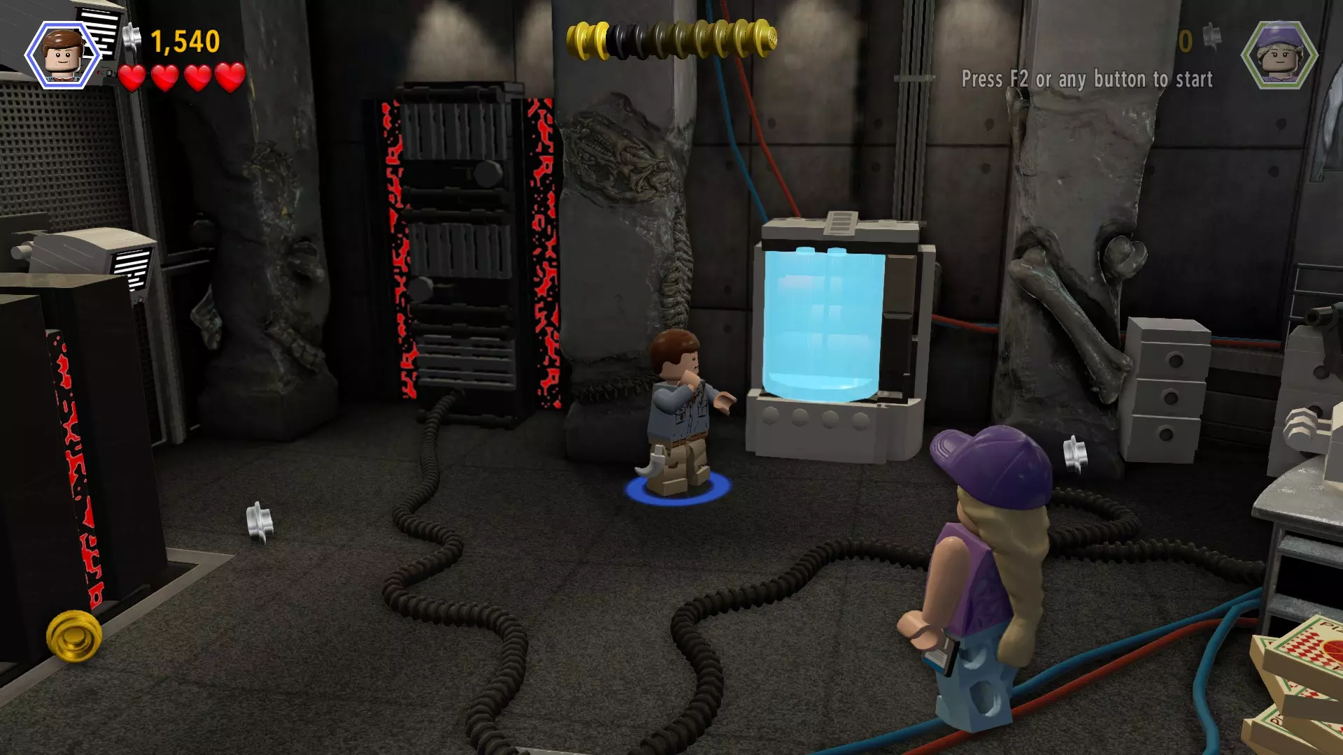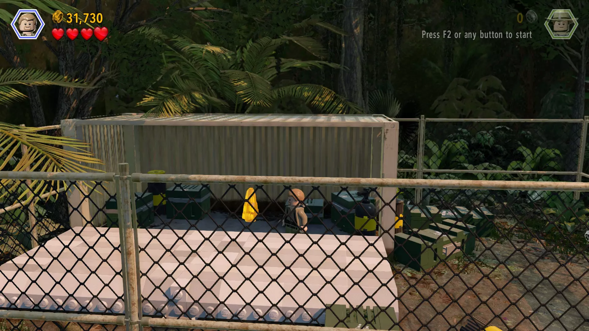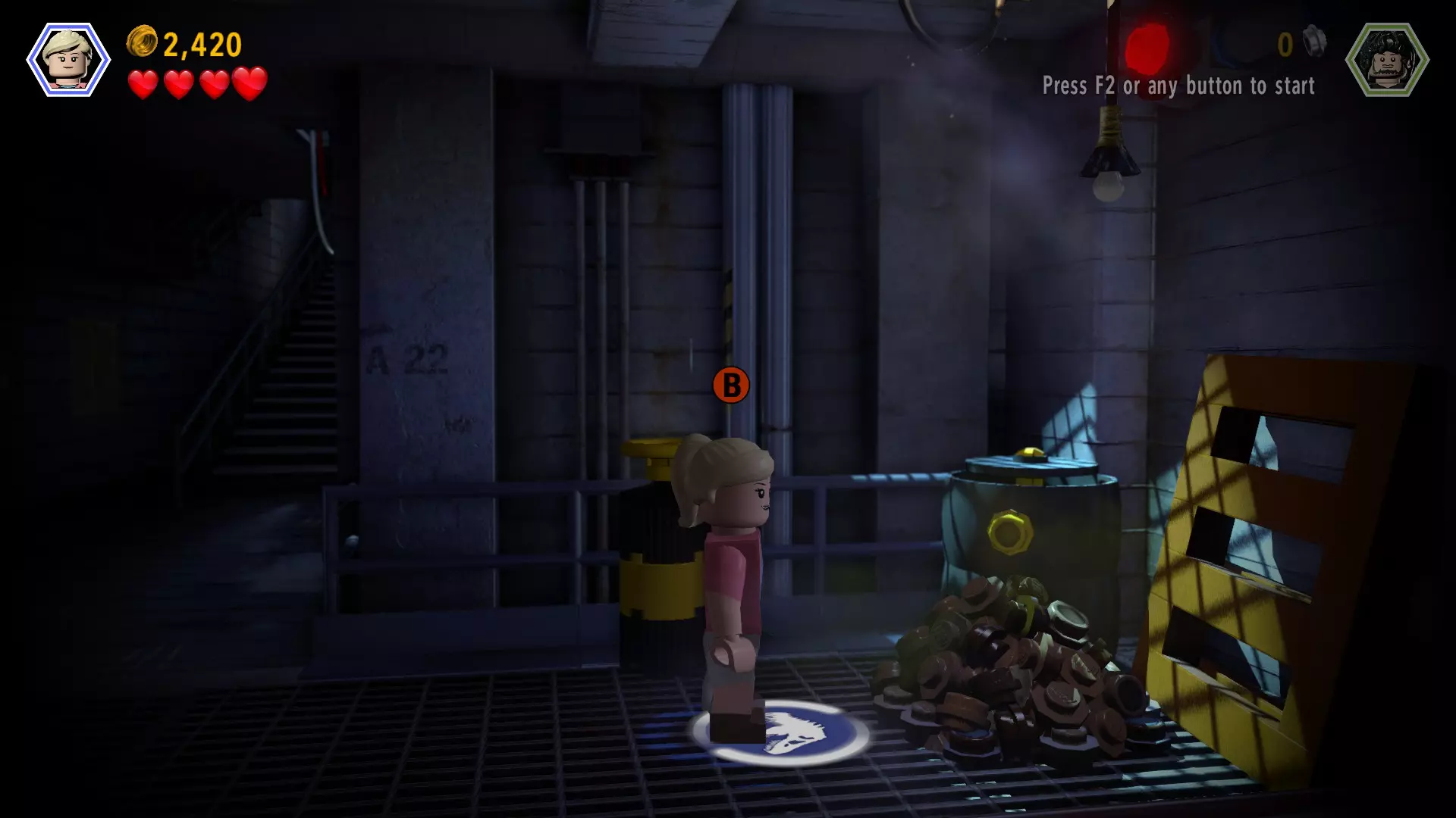 恐龙:棘龙 关卡:鸟笼(第二部分 - 翼龙巢穴) 所需角色:艾莉(带水壶)、攀爬者(比利或欧文) 位置:屋顶上方 方法:穿过右侧有围栏的通道,直到找到一个黄色箱子和一株可浇水的植物(故事模式中翼龙攻击的位置)。使用艾莉给植物浇水,它会生长出一个弹跳垫。利用弹跳垫到达 catwalk(高空走道)(这有点棘手但可以做到)。切换到攀爬角色,一直向左走,直到找到积木。
