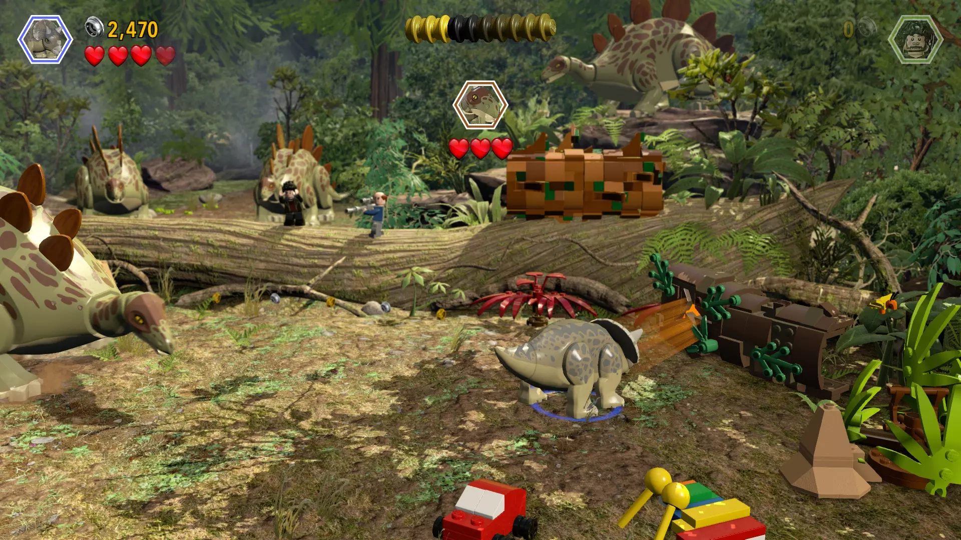 恐龙:剑龙 关卡:索纳岛(第3部分 - 剑龙群) 所需角色:具备冲撞能力的恐龙,或剑龙成年个体首领战 位置:场景中有两块巨石(屏幕左侧和底部)和一根原木(屏幕右侧),你需要将它们撞碎,或者引诱成年剑龙去撞击它们 方法:使用具备冲撞能力的恐龙撞碎巨石/原木,或者引诱成年剑龙到每个目标处,等待它用尾巴猛击地面。这种方法同样有效,但对你来说会更危险(可在故事模式中完成)