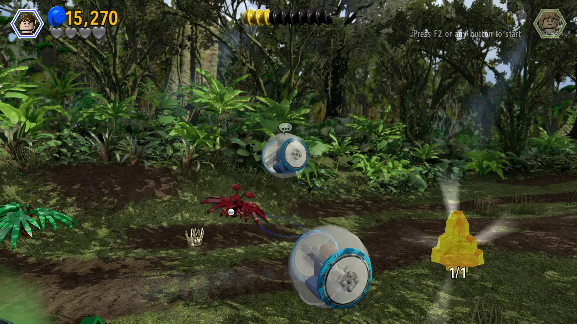 恐龙:重爪龙 关卡:棘龙(第二部分 - 坠机地点) 所需角色:能潜水的角色(萨拉·哈丁等)、迅猛龙 位置:有部分飞机残骸(垂直坠毁)的小空地 获取方法:潜入粪便中获取零件来建造轨道,然后使用迅猛龙跳起来抓住轨道。跳到上方的平台即可获得积木。