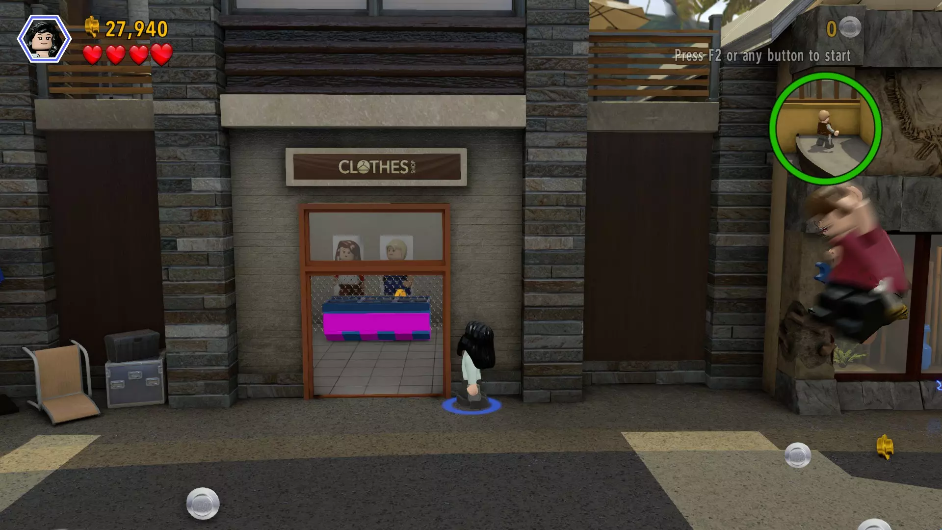 恐龙:双型齿翼龙 关卡:遭受攻击(第一部分 - 主街) 所需角色:敏捷型角色(故事模式中提供) 位置:带有“服装!”招牌的小商店 方法:从主街向左走到人行道。在墙壁倒塌后,使用杂技能力穿过带电的水域,寻找带有“服装!”招牌的小商店。商店下方有粉色和蓝色的敏捷条,你可以从下面翻越过去。砖块就在里面。