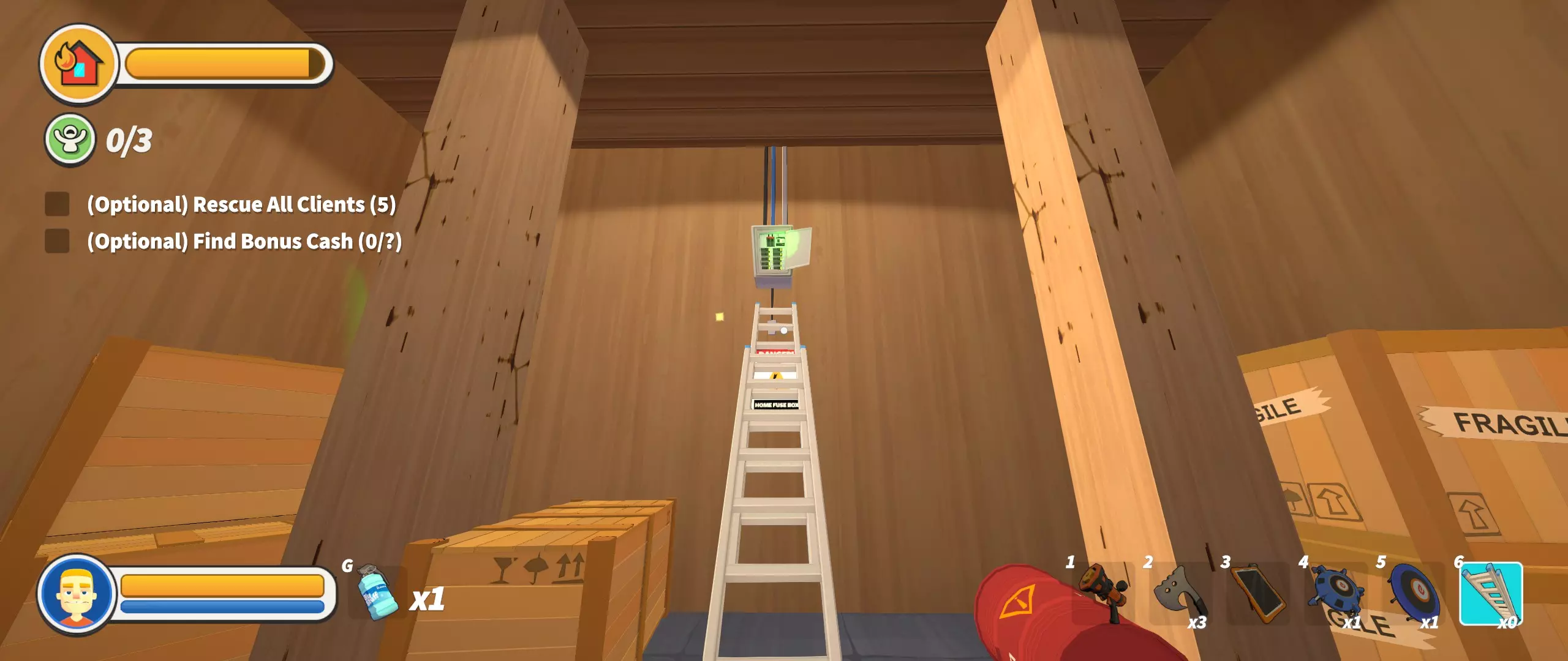 在教程后的第一关(第一大道)很容易完成,在底层,被煤气覆盖的后屋里,拿起风扇,然后你需要一个梯子,只需按E键操作保险丝盒(如图)