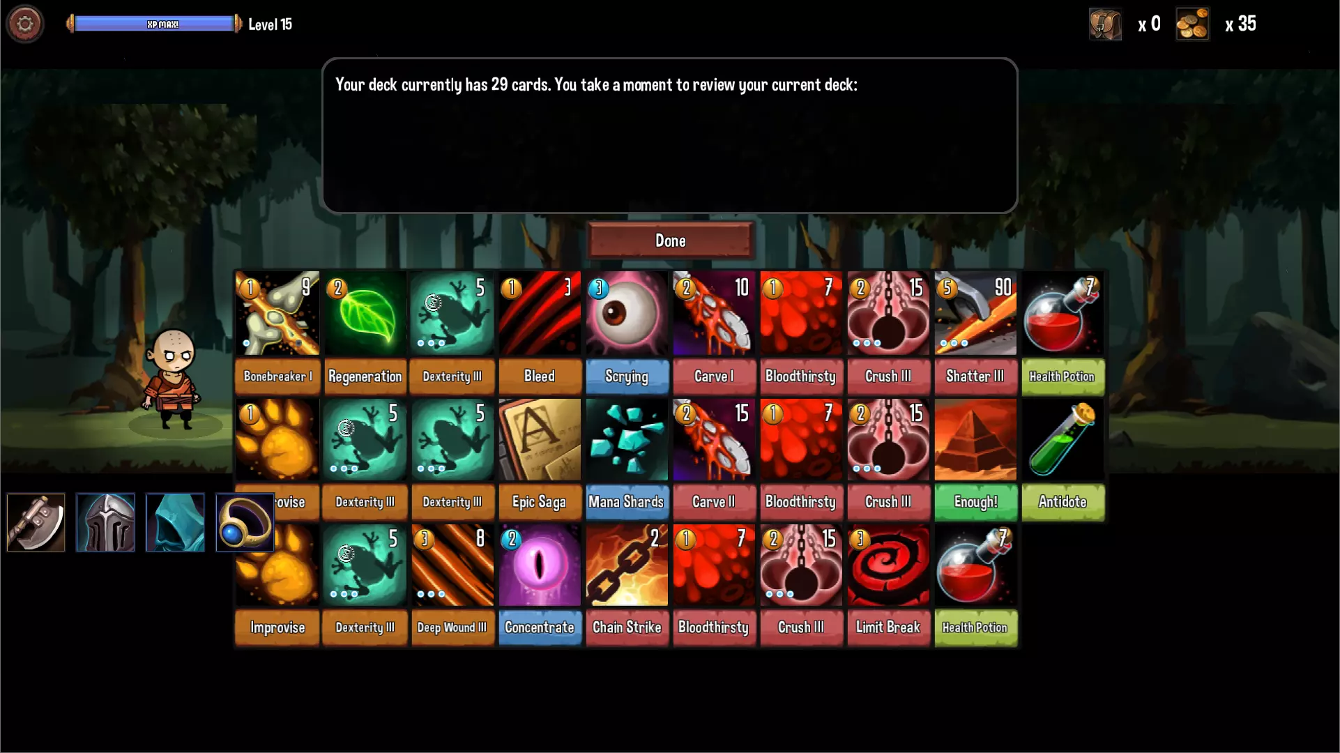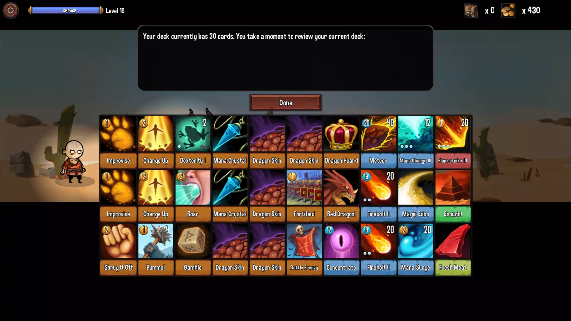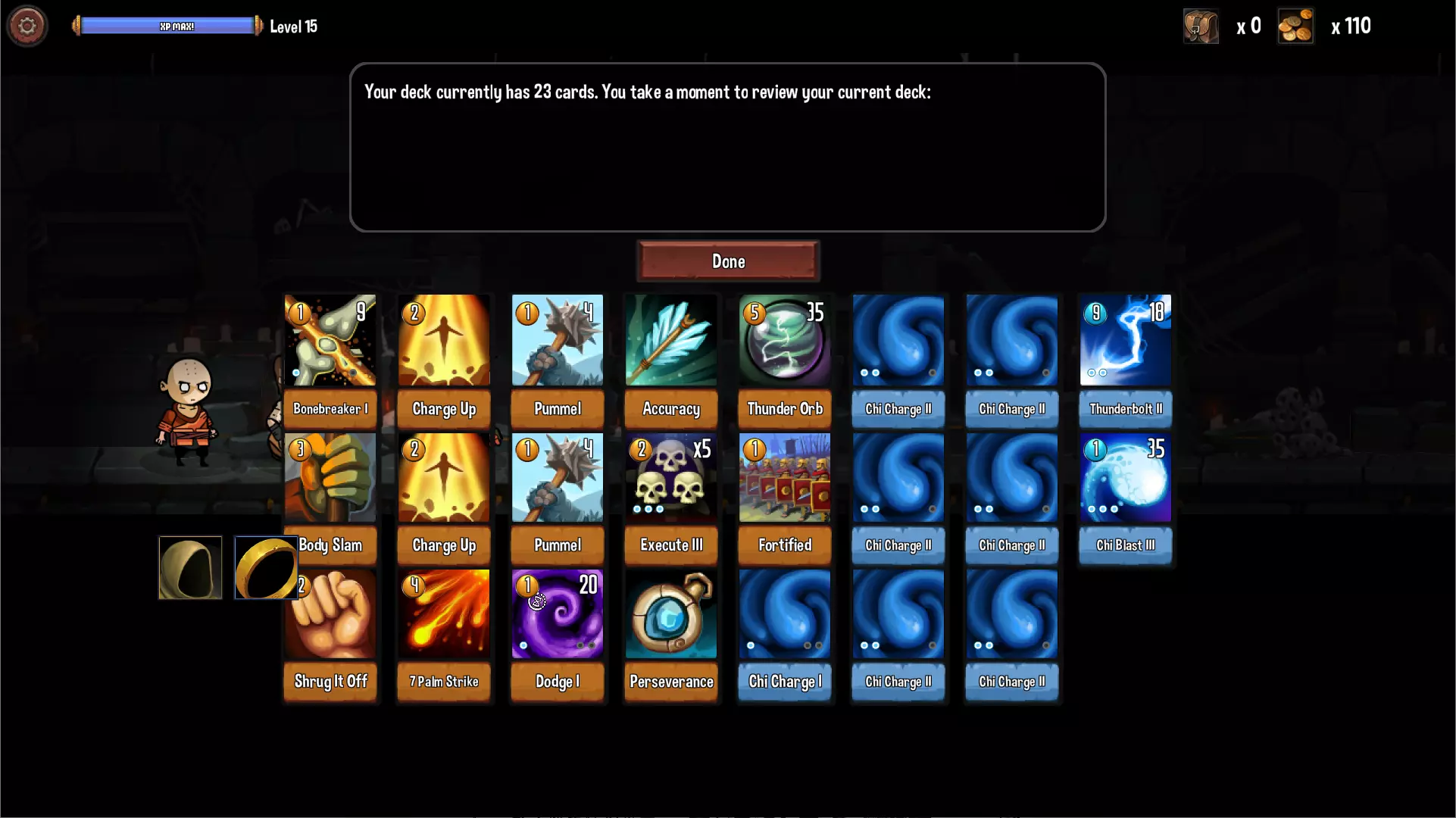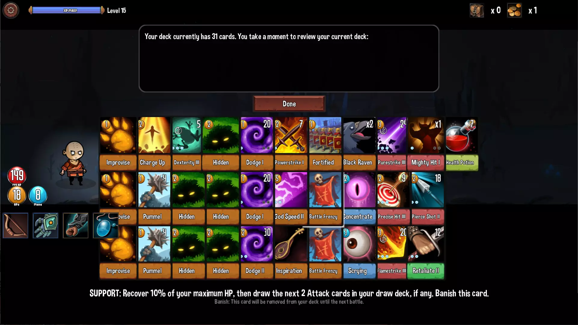职业特色是无法招募NPC,取而代之的是一只狼。狼的技能不是很强力,冷却时间也太长,基本上后期完全用不到。初期的输出技能也比较尴尬,比较好用的只有【沉默箭(Silent Arrow)】。【猛扑(Pounce)】虽然升至3阶后威力不错且附带抽卡,但使用后会被移除这一点真的是硬伤(但还是建议升级满)。【狼咬(Wolf Bite)】则是仅次于【攻击(Attack)】的垃圾卡,有余力的话请狠狠地删除。 第一層的容错率偏低,建议先把三张【猛扑(Pounce)】升级满。第二層可获得神卡【狼嚎(Wolf Howl)】,建议入手3-5张,补血补AP还能抽卡而且没代价,终于让驯兽师的生存能力达到了正常水平。第三層的【狼群攻击(Wolf Attack!)】可造成狼一半生命值的纯伤害,算是后期的主要输出手段,最多入手3张。 通用卡池方面与游侠重复,不过刷出【隐匿(Hidden)】的概率降低了不少。 【进阶职业】僧侣(Monk)
