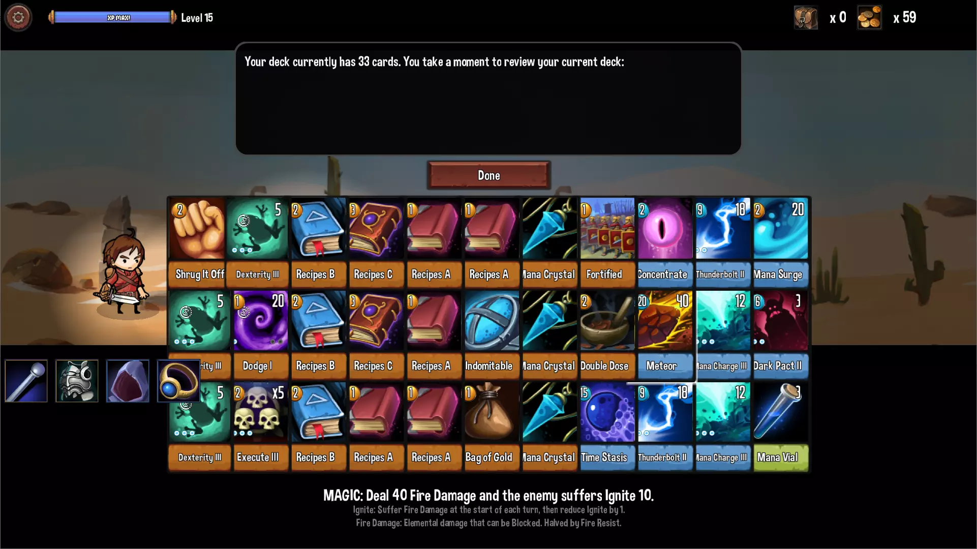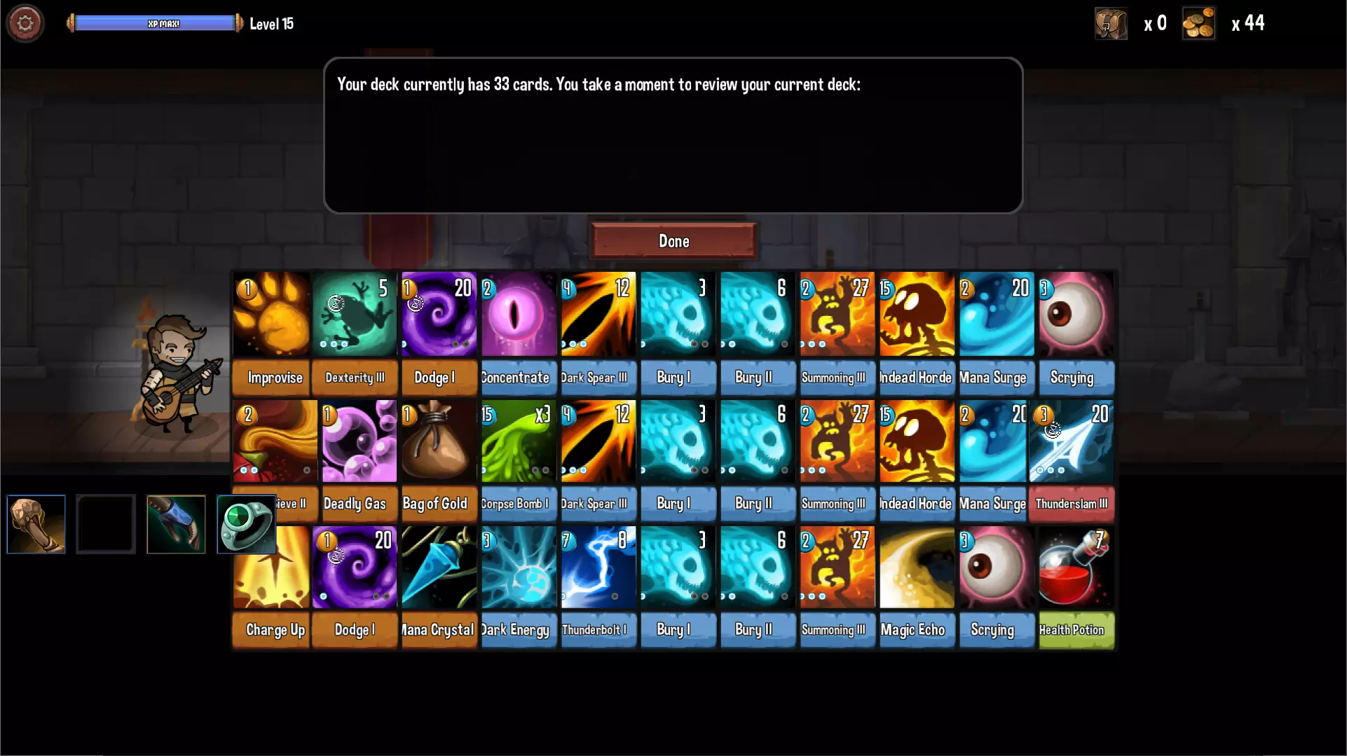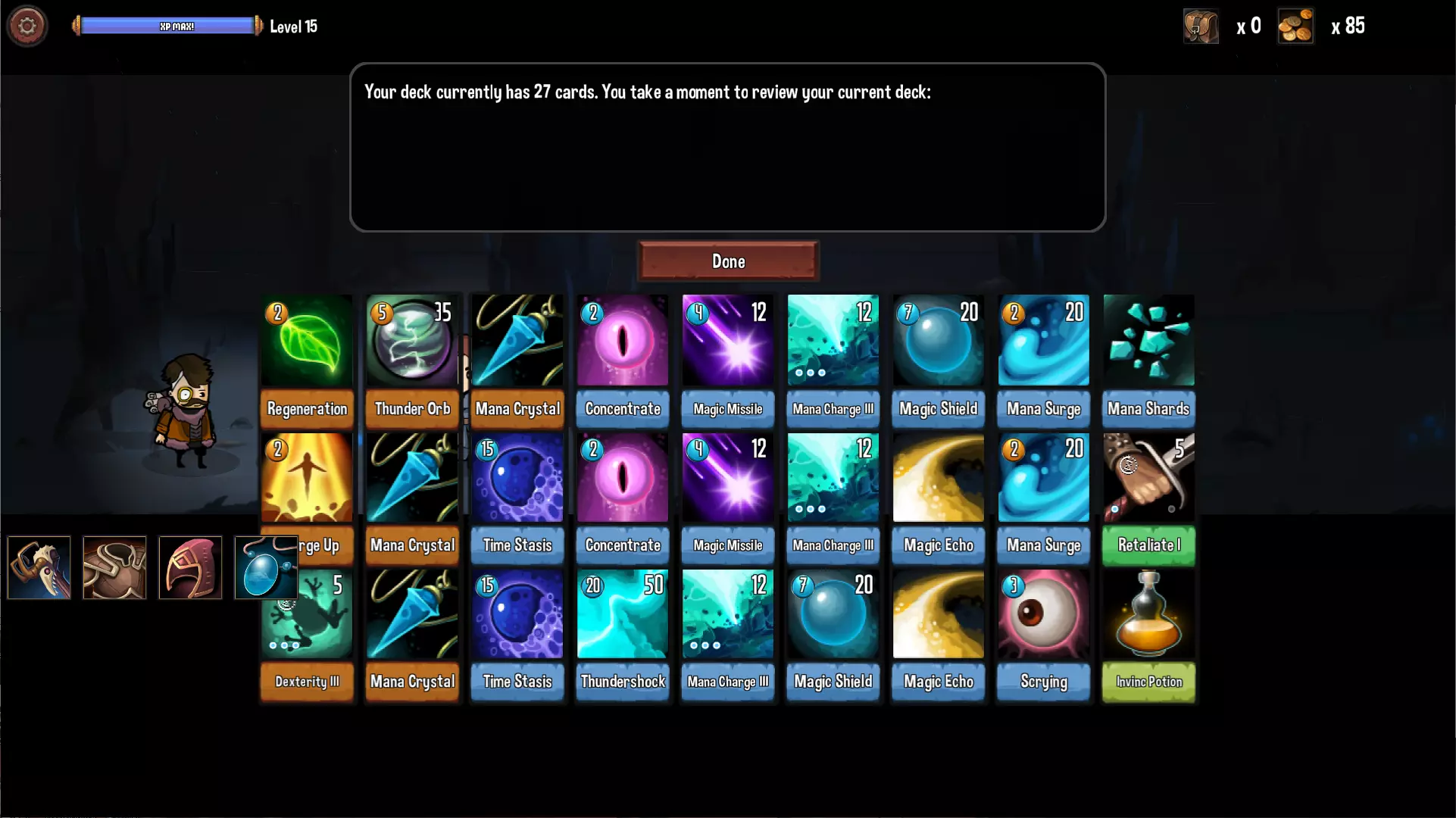 药师是擅长在战斗中制造药剂的职业。【配方】系列卡能够随机刷出固定种类的药水,药水用不到也能暂时丢掉过牌。地牢第一层的【配方A】初期用来刷属性叠加持续伤害,后期输出太低只会拿来制造【生命药剂】、【魔法药剂】与【水银药剂】用来过牌。第二层的【配方B】就比较夸张了,刷出的属性药水可以强制给对方附上属性弱点,就算敌人有抗性也会被盖过。第三层的【配方C】可以刷出满血药和无敌药等保命卡和属性三阶药水,不过AP消耗3,不建议带太多张。 初期通常还是建议玩雷属性,第一层有机会拿到【雷击】,是很强力的降AP卡,建议最好入手1张。第二层使用【配方B】时推荐优先制造【水银药剂II】,为敌人附上电属性弱点让【雷霆】伤害加倍,同时这药剂还能增加行动点与抽卡。第三层的【双倍剂量】复制药剂并抽卡,是很不错的过牌卡,主要是复制【生命】、【魔力】系列药剂达到2换3效果,复制【水银】系列药剂达到2换4~6的效果。 通用卡池偏向法系职业,主要是可以拿到【黑暗契约】和【时间停滞】,不过药师每次使用药剂都需要经过“制药”、“用药”两个步骤,很容易被对方手上的【够了!】打断,所以如果手上有【时间停滞】建议在打出第5张卡前先用掉(尤其是第三层首领),确保被打断后还是玩家的回合。【进阶职业】死灵法师