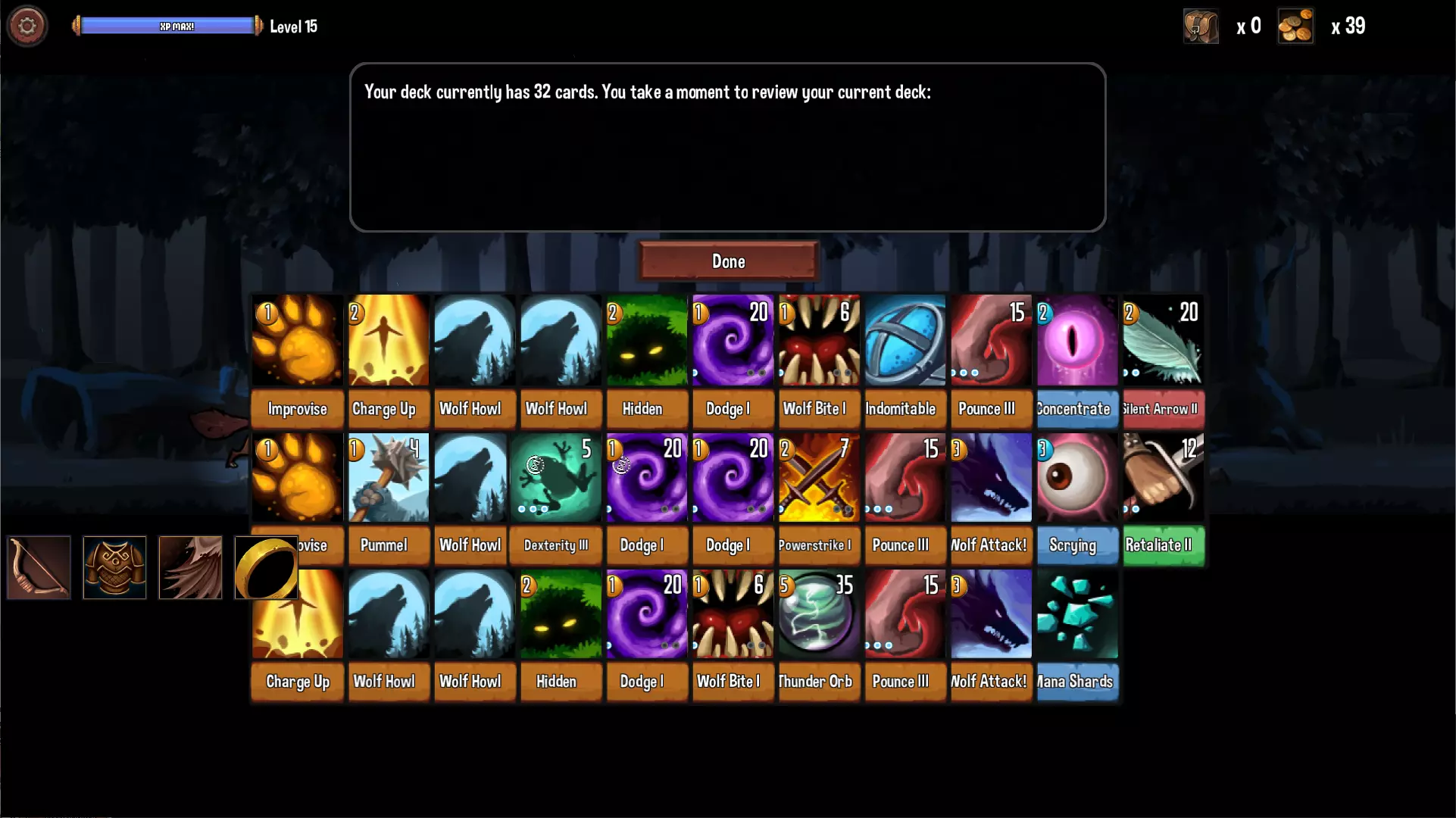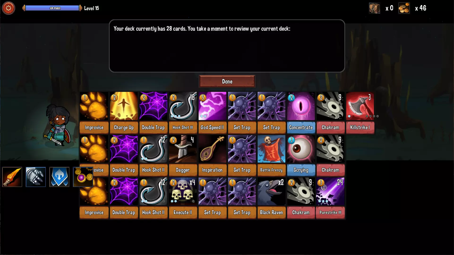 最好上手的职业。初期通过【连锁】连击、【背刺】消灭怪物。中后期随着【处决】的入手又提升了输出上限。【千刀万剐】则非常适合搭配流氓的攻击连招。由于伤害是通过多张牌累积的,很怕敌人手上有【够了!】打断回合,推荐获得【重整】并且自己回合优先出此卡,确保下回合有牌上手。【神速】可大量获得行动点和抽N卡,算是这游戏最强的卡了。 【基础职业】游侠 (Ranger)