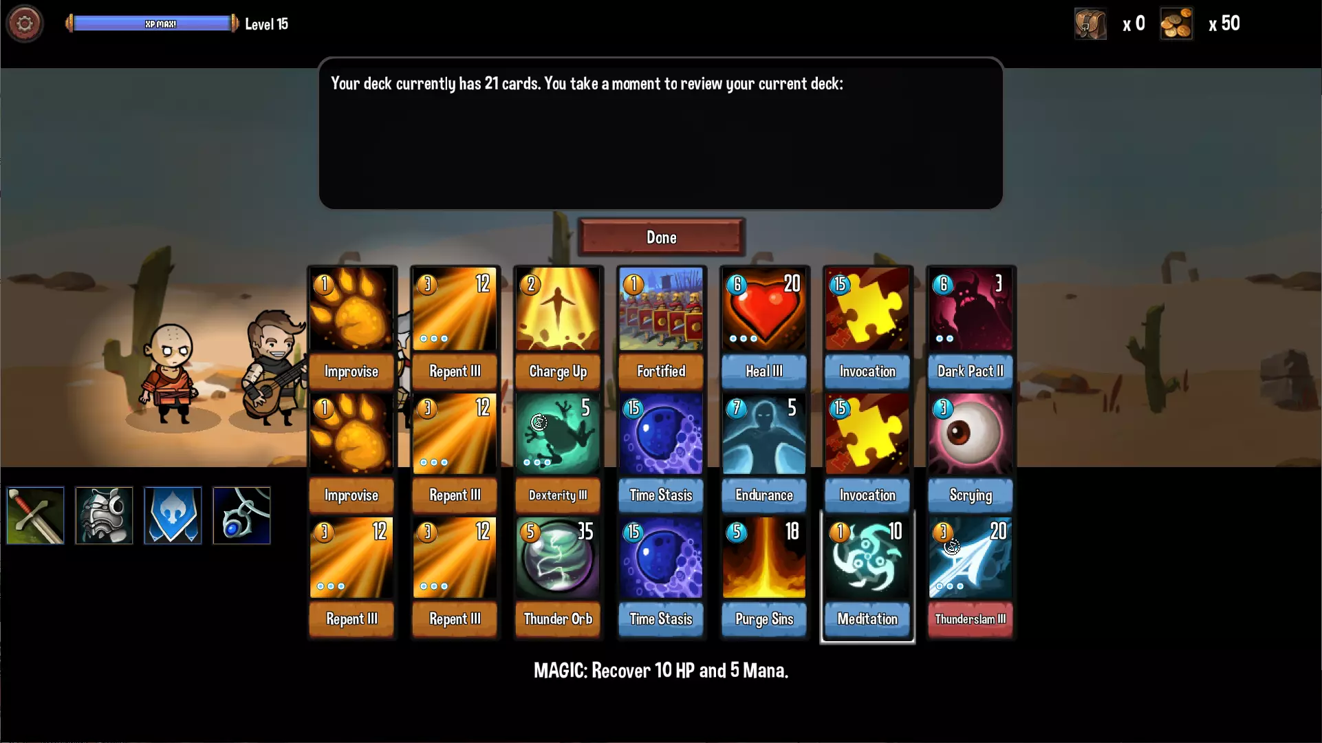 主要通过【忏悔(Repent)】叠加持续伤害,中期通过【黑暗契约(Dark Pact)】和【净化罪孽(Purge Sins)】的组合制造多张【赎罪(Penance)】并转化为抽牌数。后期使用【祈愿(Invocation)】补血上护盾、【时间停滞(Time Stasis)】获得额外一回合继续叠加【忏悔(Repent)】。 通用卡池方面,【占卜(Scrying)】可以在魔力值足够时抽魔法卡、魔力值不够时抽支援卡刷【忏悔(Repent)】。 【基础职业】巫师(Wizard)
