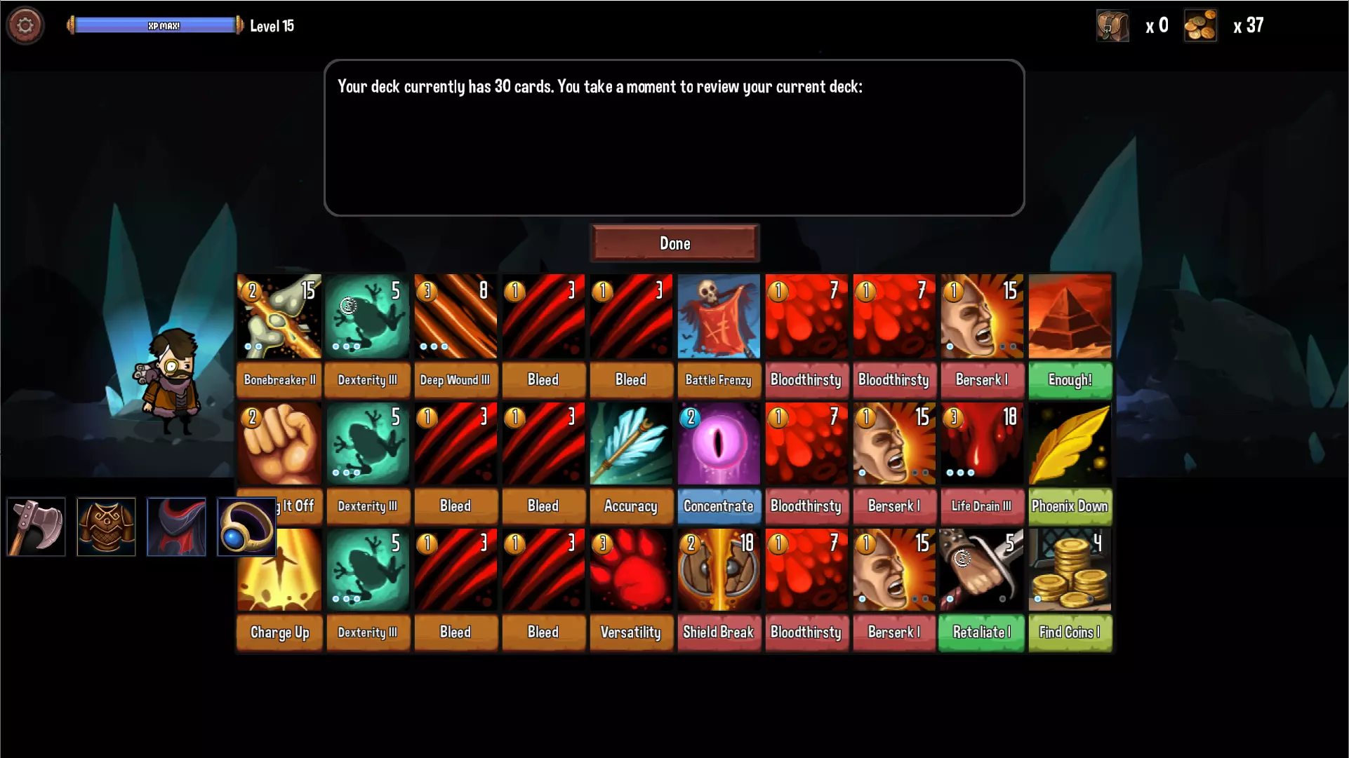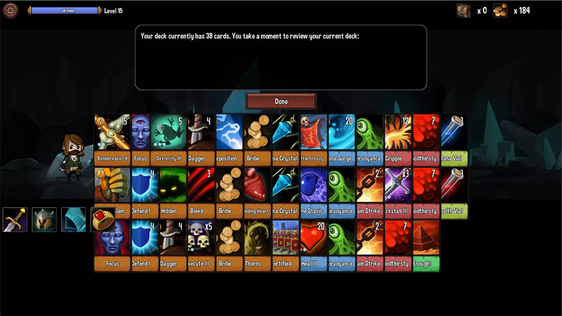 通过消耗金币来对付敌人,是商人的玩法特色……至少在地牢第一层还是如此。商店刷新物品固定为5金币也是一项优势。唯一的商人专用卡【贿赂(Bribe)】可以选择消耗1金币造成伤害、1金币丢弃敌人2张卡,或者花费自身等级×10的金币直接取得胜利(Boss战无效)。 初期打法很简单,用【发现金币(Find Coin)】获取金币,用【贿赂(Bribe)】将敌人卡片丢弃至1张或0张,【随机应变(Improvise)】优先选择抽卡再选择护盾(视情况可选择4点物理攻击进行补刀),【专注(Concentrate)】一律选择对敌人造成5点纯粹伤害,剩下的就用【攻击(Attack)】慢慢消耗。度过初期之后,玩法第一个重点在于升级时与商店里尽可能入手过牌卡,像是【防御】(Defend)这种牌也可以,同时一边删除【攻击】(Attack),提高牌组内过牌卡的浓度。若刷到【贿赂】(Bribe)可以入手最多3张。一些好用的输出型支援卡【身体猛击】(Body Slam)、【碎骨】(Bonebreaker)也可以入手。如果把对方手牌搞到剩0张,轮到他回合系统会给他保底一张手牌,这时如果有入手【隐藏】(Hidden)就可以防止他出这唯一的卡片。 过牌卡一多,连击就容易累积,这会联想到哪个职业?没错就是流氓(Rogue)。商人的第二重点是至少刷出一张【背刺】(Backstab)或【处决】(Execute),并升级至满。这样就确保商人有了稳定的伤害,同时【贿赂(Bribe)】可以专心发挥丢卡的作用而不必拿来做输出。 总而言之,商人这职业在第二层结束前一定要摸索出一个稳定的流派,东凑西凑是过不了关的。 ※【背刺(Backstab)】在第一层能刷到,【处决(Execute)】应该是在第二层之后才能刷到。 ※地牢第一层我有印象的好用过牌卡:【洞察(Clairvoyance)】、【防御(Defend)】、【流血(Bleed)】、【匕首(Dagger)】、【魔力水晶(Mana Crystal)】、【连锁打击(Chain Strike)】。 ※地牢第二层~第三层我有印象的好用过牌卡:【专注(Focus)】、【嗜血(Bloodthirsty)】、【移位(Reposition)】、【荆棘(Thorns)】、【强化(Fortified)】、【魔力涌动(Mana Surge)】、【时间停滞(Time Stasis)】。【神速】、【敏捷】、【蓄力】这几张最好用的过牌卡我从来没刷出来过,已经存档读档测试好几遍了。