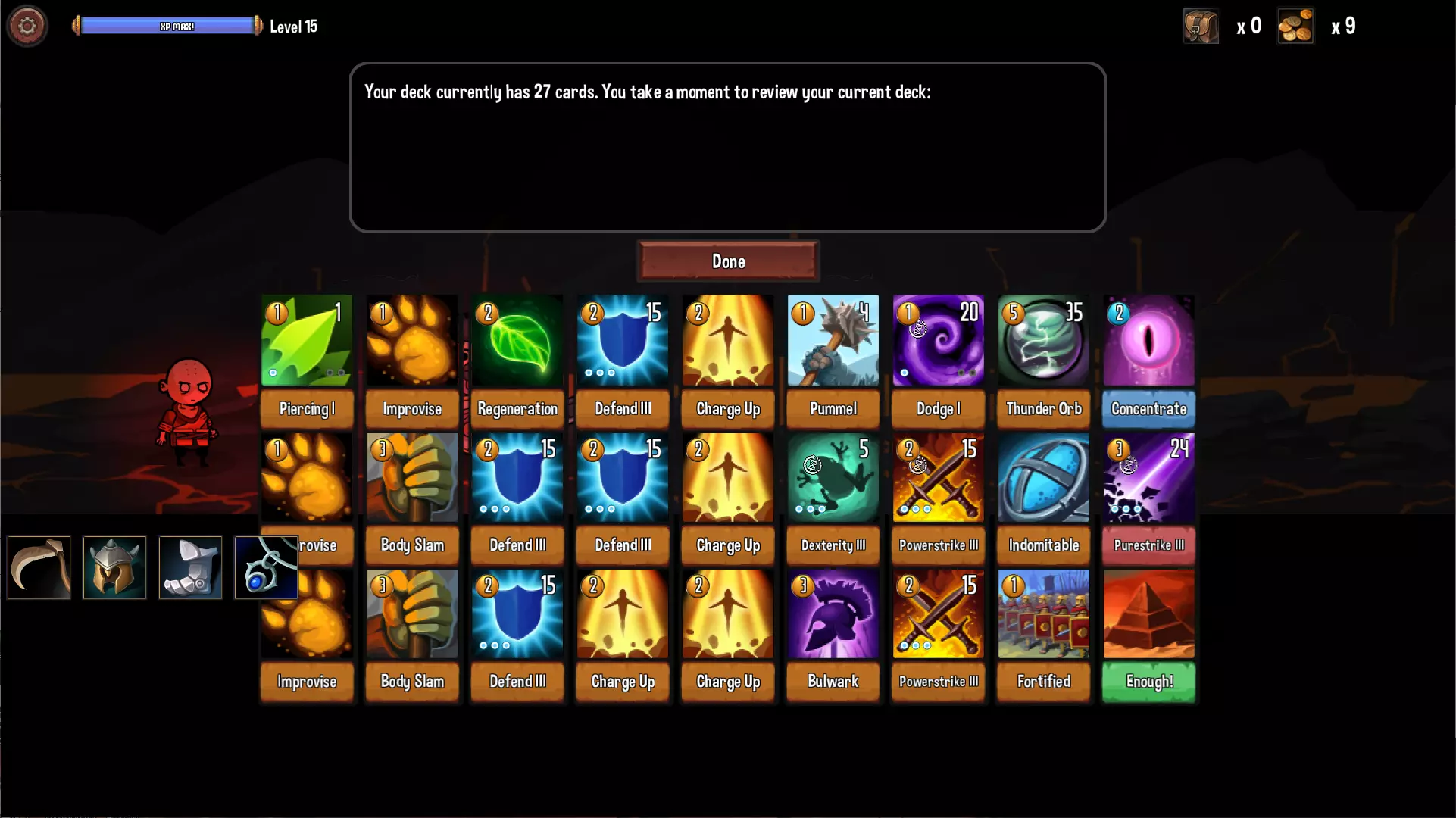 属于物魔双修的职业,以“气”相关的卡牌为核心,特色是无法装备头盔与铠甲。核心技能是【聚气(Chi Charge)】,能补充魔力、补充行动点还能抽卡。对应的初期攻击技【铁拳(Iron Fist)】则不是那么好用,输出与【普通攻击(Attack)】几乎无异,附带的1层虚弱效果也不会随着卡片升级而增加层数,这设计我是真看不懂。【气爆(Chi Blast)】与【七掌击(7 Palm Strike)】是后期的主要输出卡,尤其【七掌击(7 Palm Strike)】的7层虚弱特别强大。【顿悟(Enlighten)】获得物理免疫一回合且恢复20%生命值并除外此卡,因为僧侣本身靠【聚气(Chi Charge)】就有一定的生存能力,所以这张卡入手与否影响并不大。 通用卡池方面基本上除了弓箭系卡片,其他不管物理或魔法都涵盖进去了。好用的卡片有野蛮人的丢牌神卡【碎骨击】(Bonebreaker)(主要是看上它的丢敌卡效果,至于是否升级要考量你该轮的行动点)、骑士的【身体猛撞】(Body Slam)、流氓的输出神卡【处决】(Execute),如果嫌魔法值太少甚至有牧师的【忏悔】(Repent)可以选择。 需删除的卡片比其他职业还多,除了基本的【攻击】(Attack)和最初提到的【铁拳】(Iron Fist),专属护盾技【气劲防御】(Chi Defense)自动转换最多5行动点为护盾,效果太垃圾且会让行动点不太可控,所以也必须删除。另一方面由于僧侣的魔法值比较吃紧,一般不会特别去删的【专注】(Concentrate)也建议删除,反而【即兴发挥】(Improvise)可以留到最后再删。 【进阶职业】莽夫(Brute)