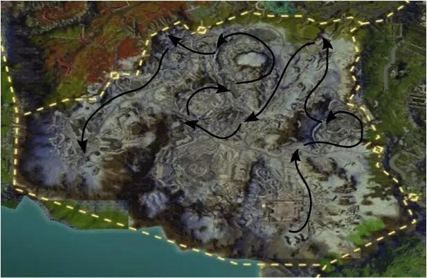 采矿指南 250-295 前往余烬岛,采集山铜矿石直至技能等级达到290。在标有“X”的位置(休眠核心)下方有不少山铜矿石节点,但它们被52级精英怪包围。在下方蓝色区域击败265级的海盗爪牙后进行采集。 余烬岛 - 山铜矿石