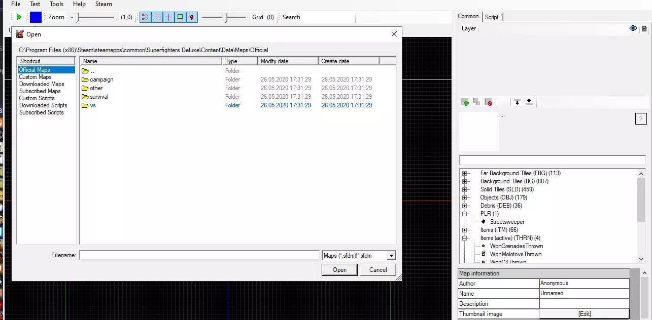 在本指南中,我将介绍如何在不完成挑战的情况下获取挑战奖励(通过修改文件) 开始 每个人都想完成困难的挑战,以获得作为玩家配饰的奖励。但没人知道如何完成所有(或某个)挑战,当然你可以尝试完成挑战并从中获得游戏技巧,但你也可以不完成挑战,通过修改文件来获取物品。感兴趣的人可以继续阅读 SFD文件 首先,你需要找到官方的SFD数据,更确切地说是游戏文件夹。我们通过Steam来操作 1. 将鼠标悬停在游戏【超级战士 deluxe】上 2. 点击鼠标右键 3. 然后点击【属性...】 4. 进入【本地文件】 5.点击【查看本地文件】 之后,进入【Content>Data>Maps>Official>vs】,不要关闭文件夹 地图编辑器 然后进入游戏并打开地图编辑器,这里有两个选项,你可以为挑战创建一张简易地图(添加武器、无限生命或两者皆有)
