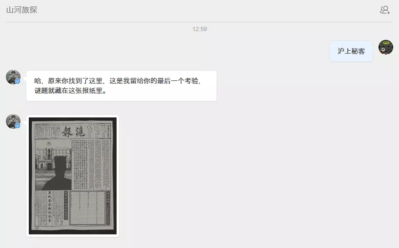 具体技术手段不多介绍,各位自己想办法,解出来的字是:【山河旅探】微博/私信【沪上秘客】。这个很清楚了,话不多说跑去微博,关注【山河旅探】,私信【沪上秘客】。 第二个谜题(后面没了) 根据上一节得到的信息操作,会有如下的互动: