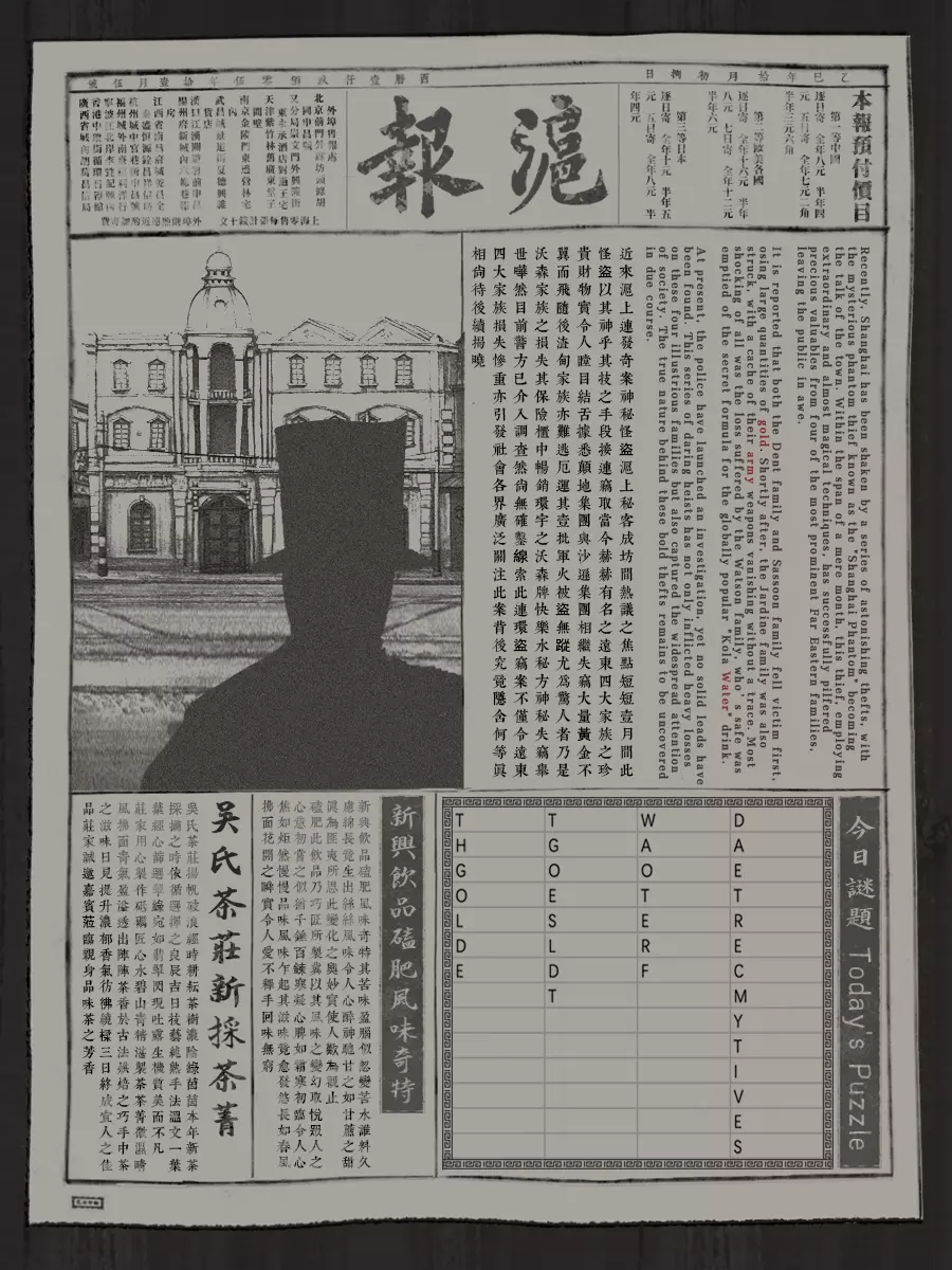 右下角便是谜题本身。 依靠强大的英文嗅觉,我们很快可以把右下角四列各分成两个单词(从上往下找),得到: 第一列 the gold 第二列 test gold 第三栏 water of 第四列 detectives army 在中间偏右的英文里gold、water和army三个词被标红,从我们刚刚找到的单词里剔除这些单词,得到最后的谜底:the test of detectives 把谜底输出到刚刚的网站上,我们就进入了通关页面。