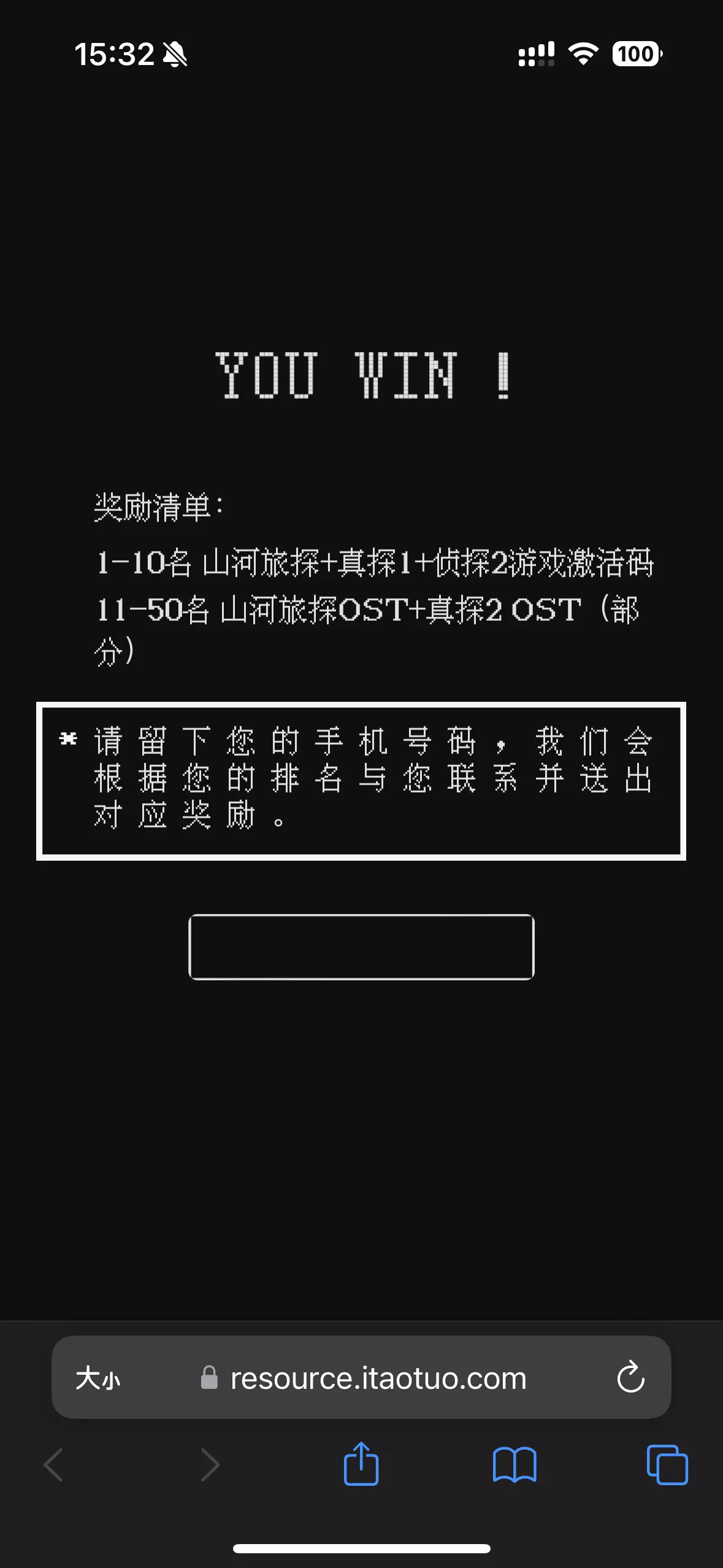 这下一个谜题的答案要输给这个网站,这个网站要用手机打开(实际上用chrome伪造一下设备也是可以的,它的js里检查是不是安卓、苹果系统、苹果手机啥的,同时html里的内容也揭示了这个谜题会给前1-50名发奖励,这些技术手段的hack就不深入了,谁有想法自己去挖,就是个很简单的网站)。里面是一个请输入答案的输入框。