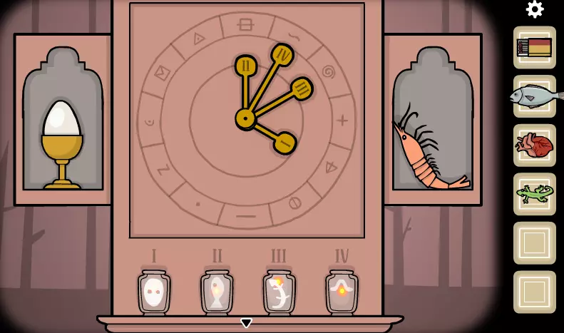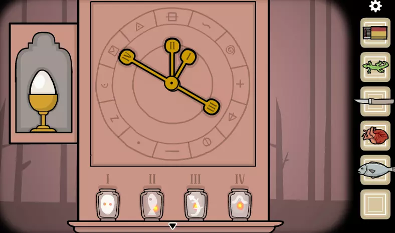 拿起中间的书。 向左两次来到窗户处。 将弹珠放在每个角落,并将壁虎换成心脏。 点击洞口并向前两次。 向右走,与地板上的书互动。 退出并再次向右走。 点击时钟,将时间设置为8:25。 拿起三角钥匙。 向左回到窗户处,取下心脏,放上鱼。 穿过洞口并向前两次。 向右两次,将时间设置为2:15。 拿起三角钥匙。 向左回到窗户处,取下鱼,放上心脏。 穿过洞口并向前两次。 向左两次,点击时钟的底部。 放入每把三角钥匙以填满插槽,然后按下按钮。 打开时钟的隔层。点击那个男人,让他摔倒在地,然后点击他的手找到一颗种子。捡起种子。 退出当前界面,向左走两次。 将种子种到花盆里。 退出当前界面,向右走到窗户处。 取下心脏,放上鱼,然后穿过洞口。 在任意地方使用罐子装满水。 向右走到窗户处,捡起鱼,把心脏放回原位。 穿过洞口。 点击花盆,使用装水的罐子。 退出当前界面,向右走到窗户处。 取下心脏,放上壁虎,然后穿过洞口。 放大花朵,点击花瓣将其摘下。 捡起虫子。 退出当前界面,向右走到窗户处。 取下壁虎,放上虫子。 穿过洞口。