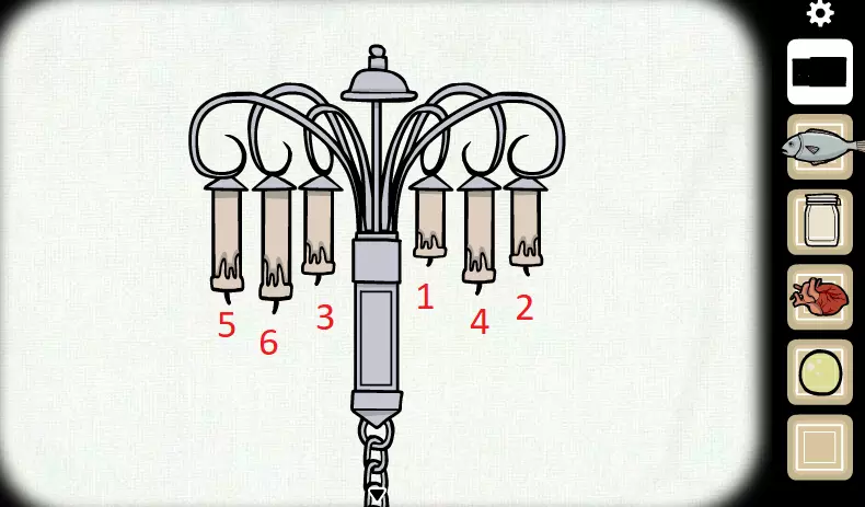 从盒子里拿起第二根蜡烛。 打开第二、第三和第四个抽屉,分别拿起小刀、鱼和第三根蜡烛。 向右走,靠近电话,用小刀打开信件。 退出界面。 拿起电话,点击信件以拼出“Enlighten Me”。 拿起火柴。 退出界面并向右走。 打开窗户,用小刀在左上角割开,展开一幅画。 将蜡烛放在每个可用的位置上,并用火柴点燃它们。 把鱼放在中间的盘子里。 点击打开的洞口,向前走两次。