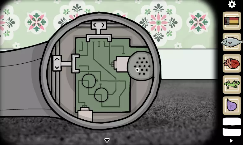 向右移动三次,直到看到一片漂浮的花瓣,然后点击它几次并离开该场景。 返回场景,发现花瓣掉落在地板上,捡起它。 向左走到男人那里,放大时钟。 拿起小刀,移开木棍,在木棍后面找到第二片花瓣。 向左走,靠近地板上的书,用火柴将书撑开。 捡起第三片花瓣。 退出当前界面并向左走。 点击电话三次,使耳机掉落到地板上。 点击耳机进行放大。 用小刀卸下螺丝,检查电路。 解开谜题:
