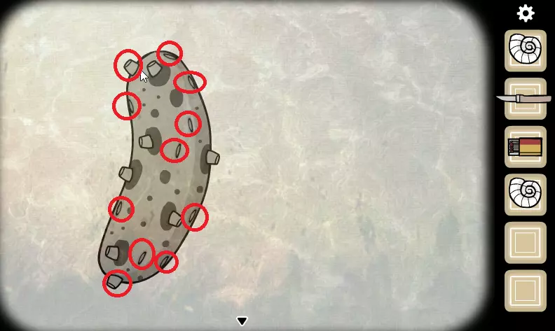 放大镜子,从顶部拿起贝壳。 退出,向右走两次。 点击漂浮的瓶子,多次点击瓶身上的裂缝直至其破碎。 拿起第二个贝壳。 退出,向右走。 点击漂浮的腌黄瓜,通过点击按钮来解谜(顺序无关):