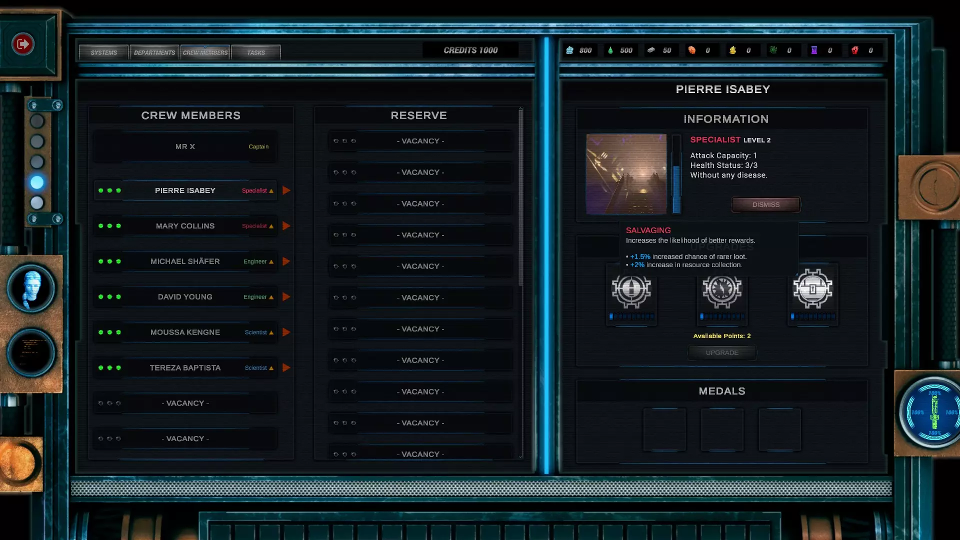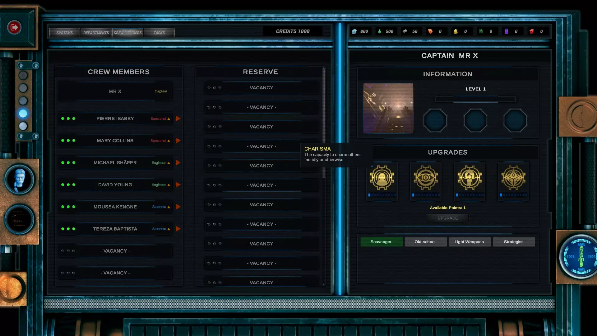 如果你想挑战一下,这个选择会很不错。 在你的舰船属性面板下,有一个选项可以更改初始武器装备。前期的导弹相当好用,因为它们能无视护盾,而且你在游戏初期遇到的大多数敌人都没有高射炮来拦截你的导弹。如果能靠近敌人,你的大部分导弹都能命中目标。 关于船长: 这里我会让你自己决定,毕竟这是你的旅程。但要注意,有些特长非常强力,而有些负面特长则可能带来不小的麻烦。在旅程中你会获得更多特长。 比如说,如果你有一个能增加护盾或船体生命值的特长,你的舰船就会变得更耐打一些。游戏内提示: 这一点非常重要,而序章似乎并未提及:当你控制飞船时,按“I”键打开物品栏,选择船员标签,点击你的船长或船员,然后在屏幕右侧中间位置,你会看到可以升级一项专长。我不会详细说明具体升级哪项专长,因为最终选择权在你手中,但尽早开始这样做对生存至关重要,原因如下: 你的船长技能及升级方法:
