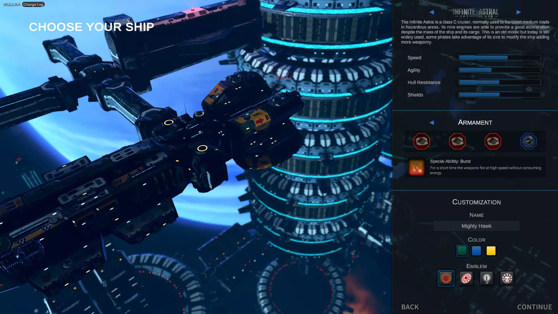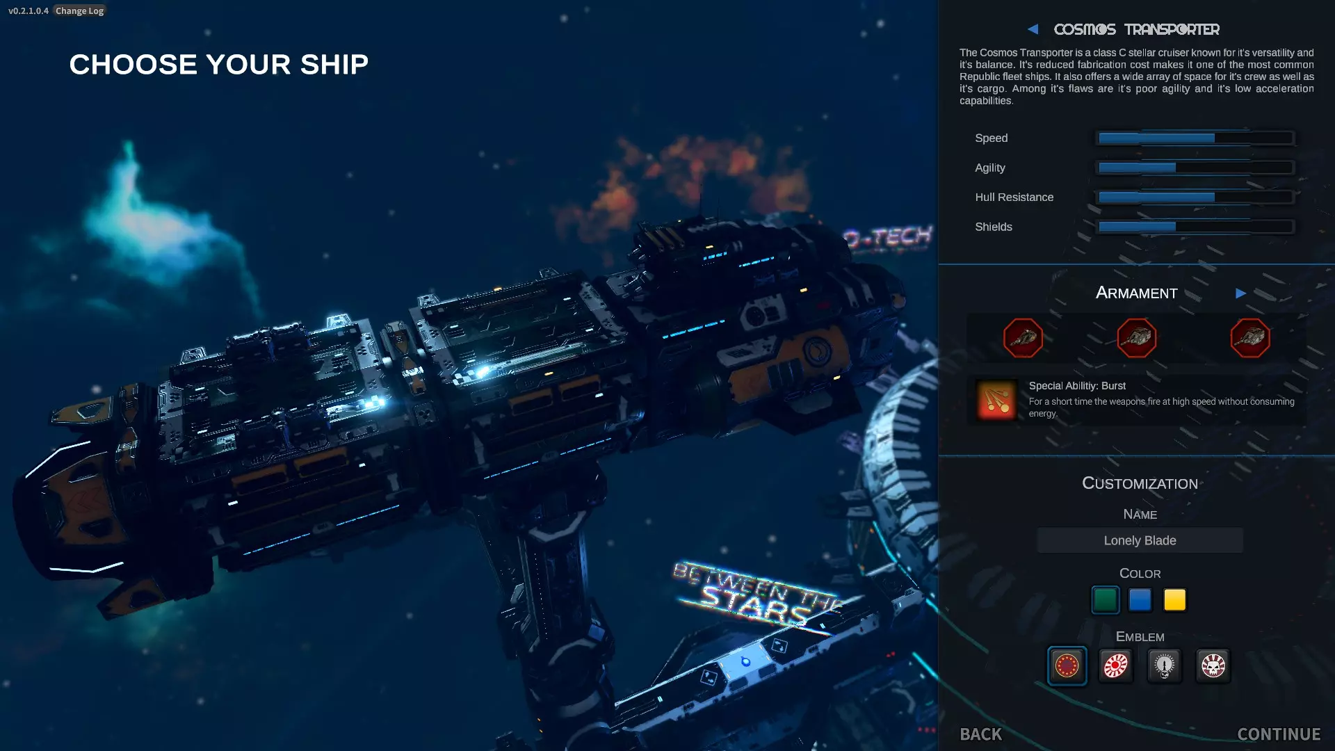 这艘船在游戏的大部分阶段都非常出色。我在永久死亡模式中就使用这艘船。注意,这里我更换了它的武器装备。 第三艘船: - 船体点数比第二艘船多,但护盾更少,整体属性不如第一艘船 - 装备槽位不多