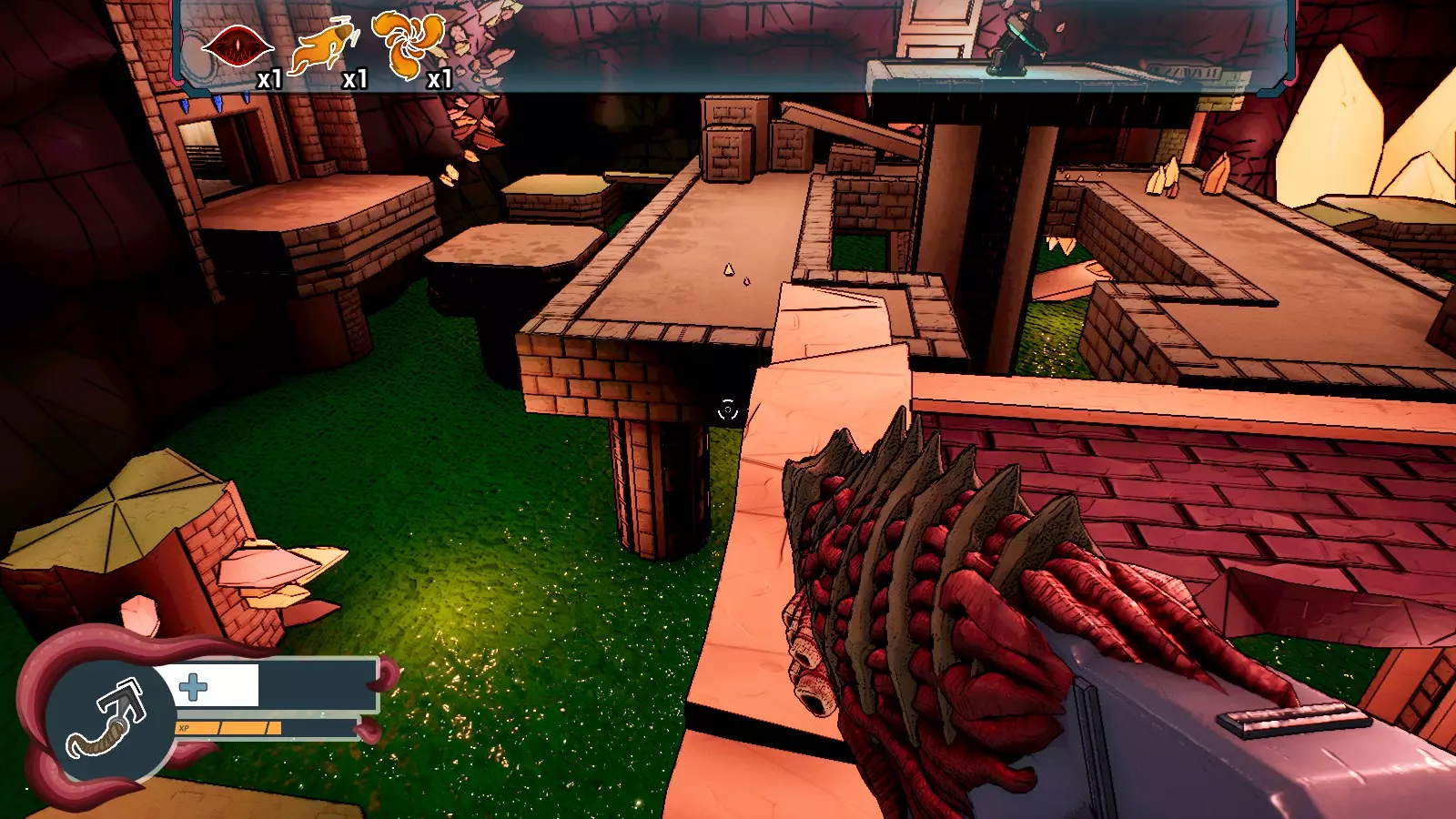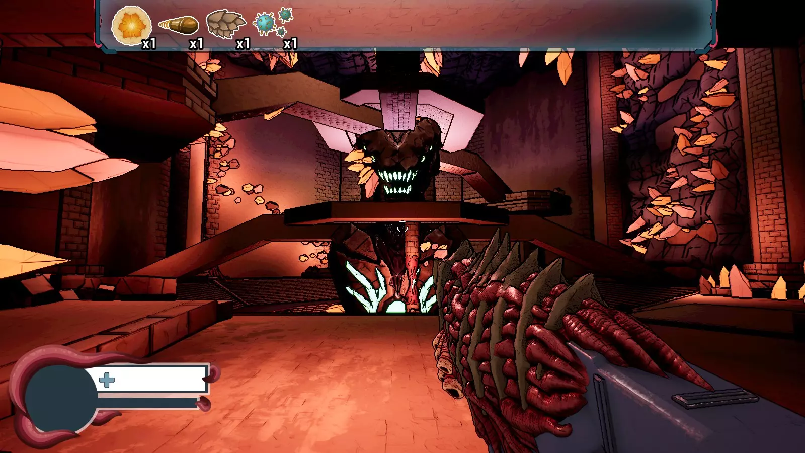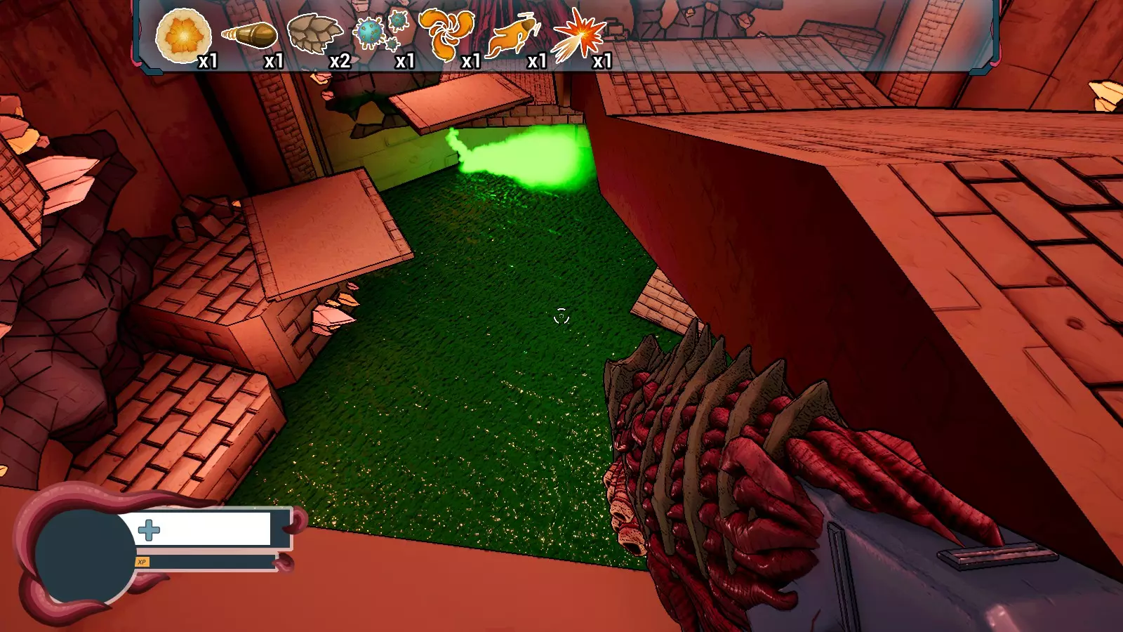 - 用于躲避 Boss 攻击 效果:快速抓钩至地形 类型:主动道具(鼠标右键) 游戏内描述:通过重新分配肌肉结构,可在食道接口底部构建一个类似舌头的器官,有助于快速移动 关卡 仅有三个关卡,每个关卡包含三个 Boss。每个关卡包含两个随机生成的竞技场。游戏共有五种竞技场类型。 一个游泳池