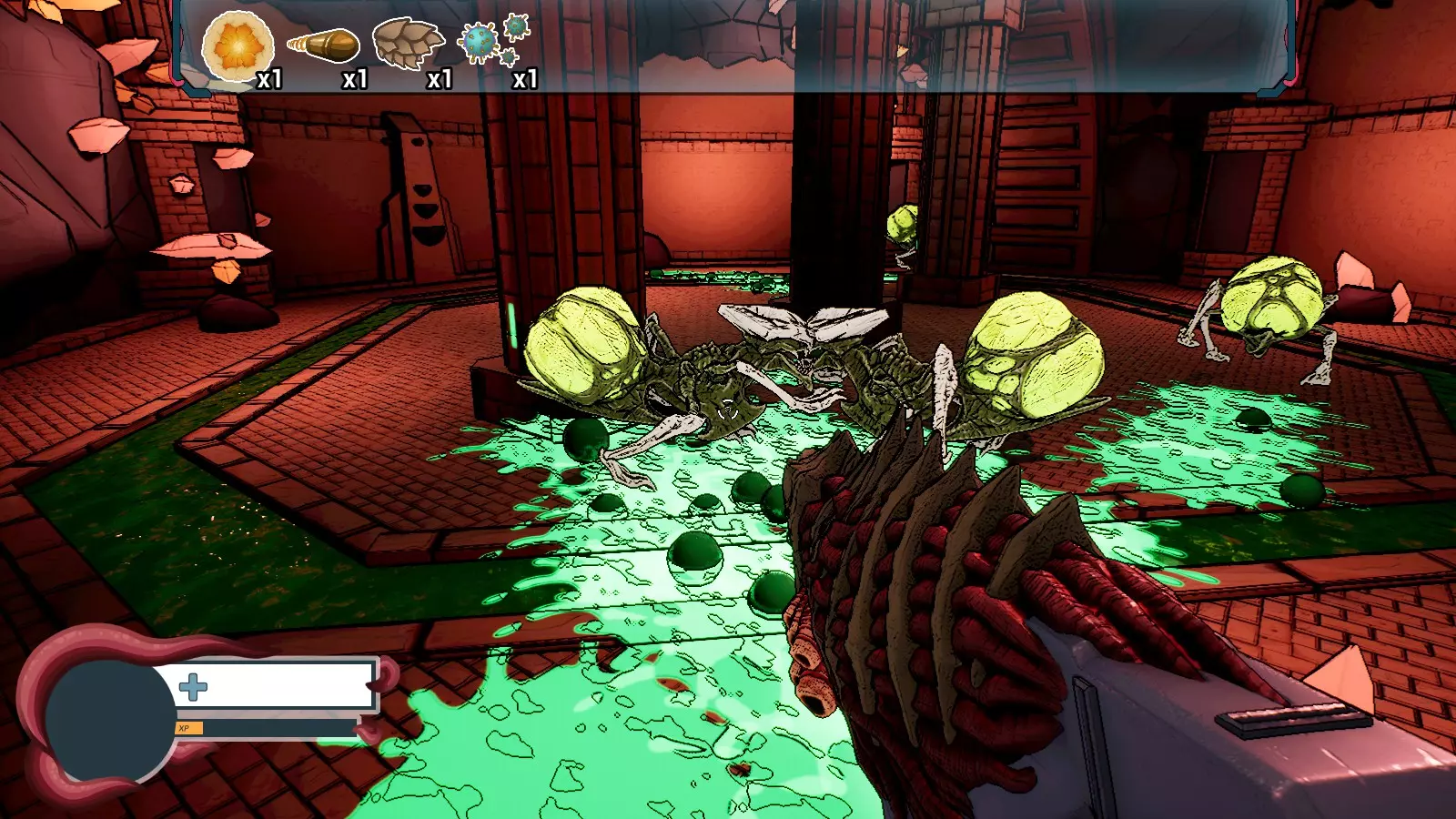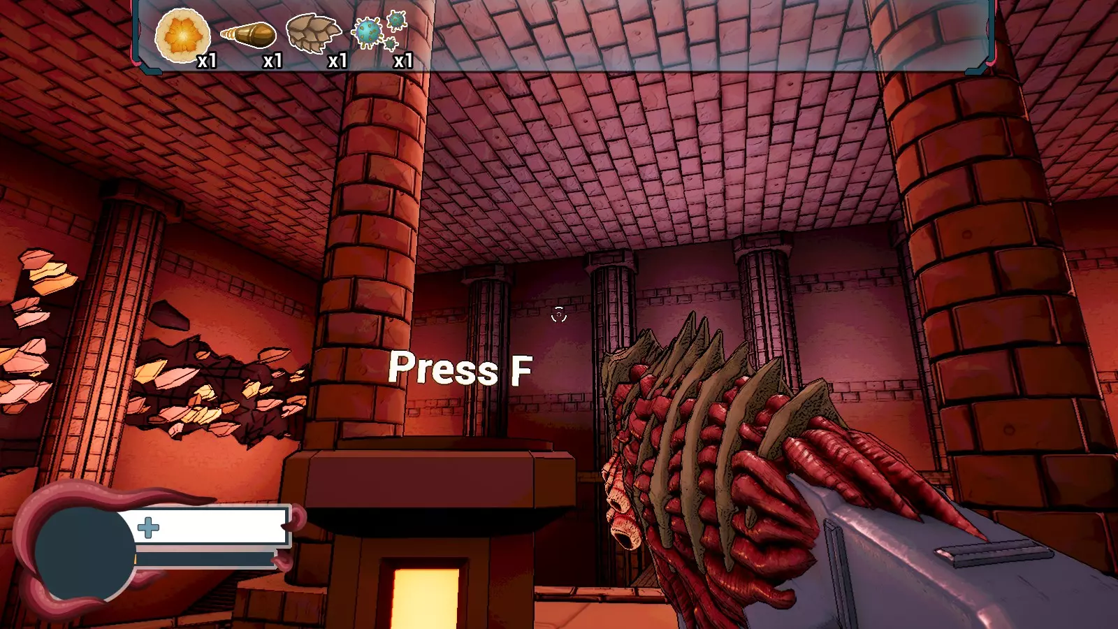 就是别按F键。 还有一件事。敌人总是卡在墙里。你能听到它们的声音,如果你靠近墙壁就会受到伤害,你可以直接穿墙射击杀死它们。 BOSS 1. 巨型酸液蚂蚁