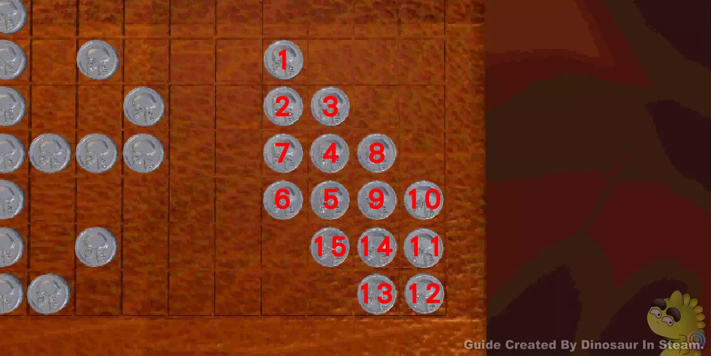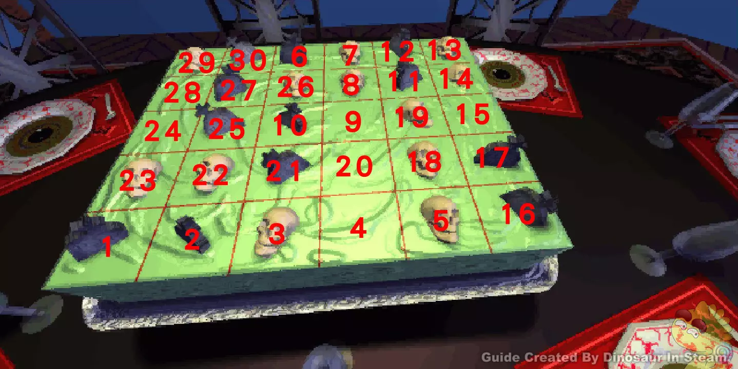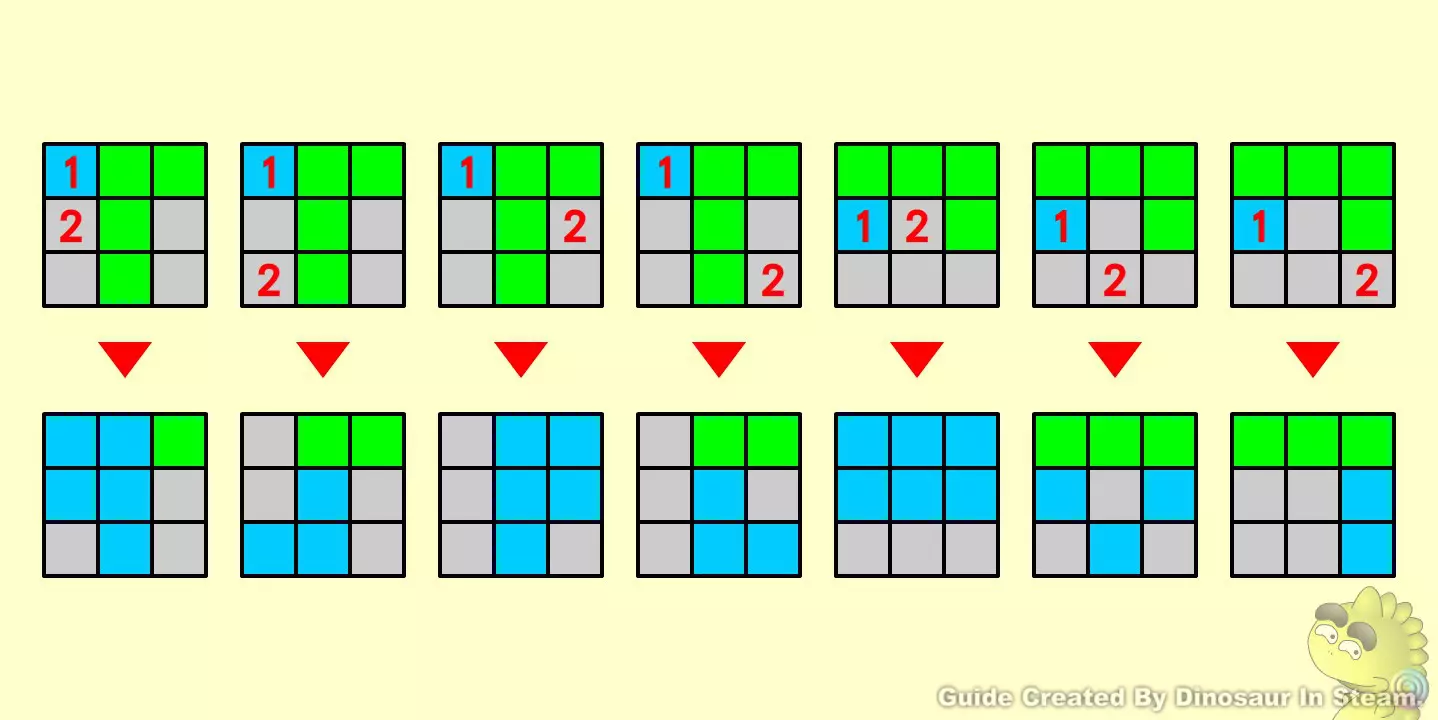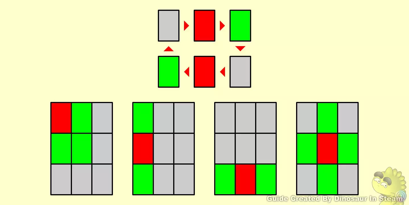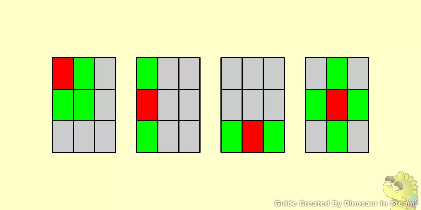 G07此游戏为随机排列组合,排列组合可以通过重新游戏来改变组合,借此寻找较为简单的组合来破解。 下面附图为游戏规则所影响范围与过关范例,必须要把九个棺墓都盖起来才可以过关。