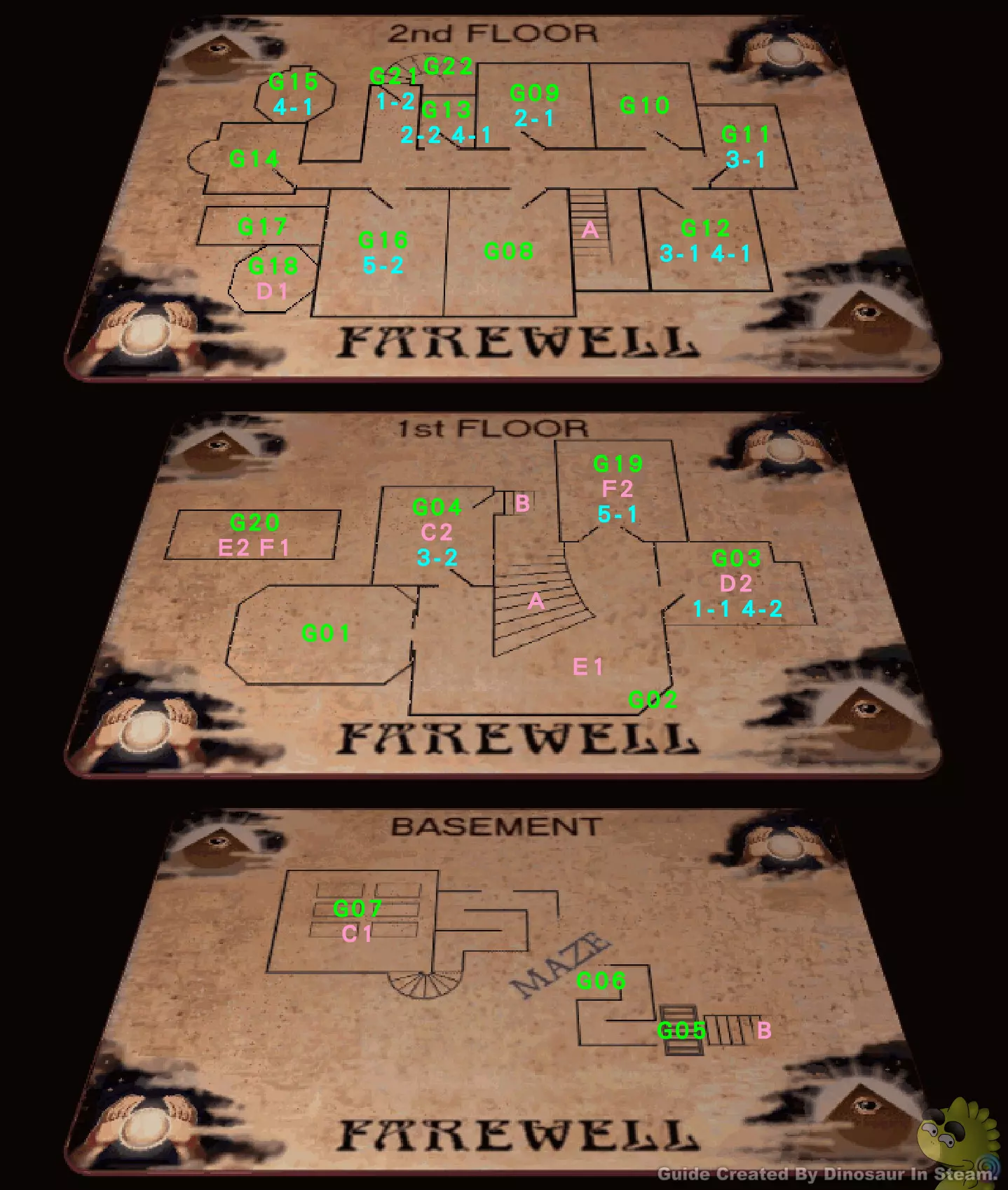 房屋地图(关卡、路径、捷径) 谜题关卡:G01~G22。 必要路径:A←→A、B←→B、C1→C2、D1→D2、E1→E2、F1→F2。