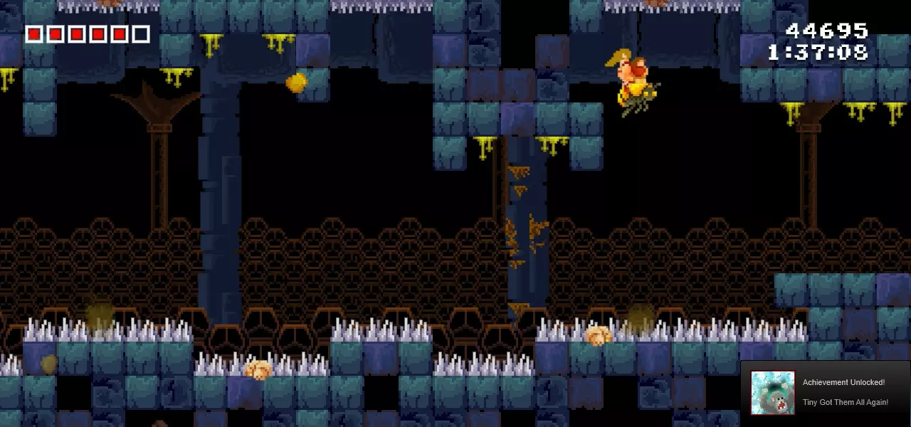 抓住蜜蜂,然后走下方的路返回。这样你就能破坏之前够不到的方块,获取金币、鸡腿和钻石。 第15颗钻石