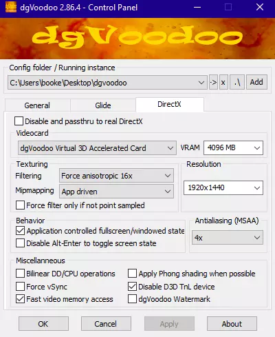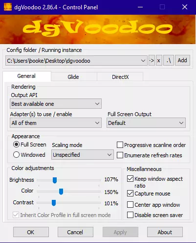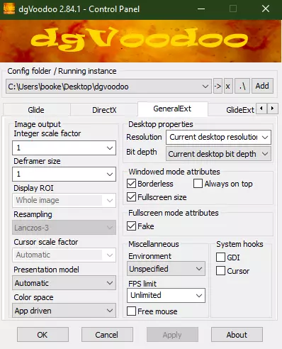 1. 从创作者网站下载DgVoodoo 2 2. 解压文件 3. 打开dgVoodooCpl.exe DgVoodoo 2设置 1. 打开控制面板后,在【常规】选项卡中复制这些设置。你可以根据自己的喜好设置颜色,但我个人的设置看起来效果更好。确保适配器设置为你的主显卡。