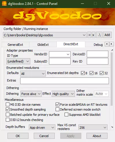 5. 应该就是这样了,但在点击应用之前,请检查DirectXExt选项卡并复制我的设置。它们应该是默认设置,但如果不是,请复制这些设置。