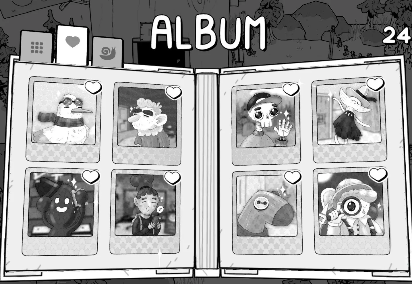 Collect Them All 拍摄图鉴中的所有事物 Look at those Cuties 拍摄开发团队的所有动物 有几只动物是有名字的,但只要你收集了图鉴中的所有动物,就没问题了 Home Sweet Home 拍摄奶奶的房子 The Calm Forest 造访橡果镇 A Majestic Hotel 从观景台拍摄橡树酒店 在橡果镇的观景台拍摄酒店照片 Nature's Show-Stopper 完成橡果镇的摄影挑战 Strong as an Oak 完成橡果镇的所有任务 Set Sail for Good Weather 造访斯坦港 A Voyage Underwater 拍摄微笑猎人号 获得潜水头盔后进行潜水,海滩上有个地方,水下有个观景台寻找沉船 平静如海面 完成斯坦港的摄影挑战 适航 完成斯坦港的所有任务 大城市 访问日志城 宏伟钟楼 拍摄宏伟钟表匠的特别活动 拍摄日志城的宏伟钟楼照片