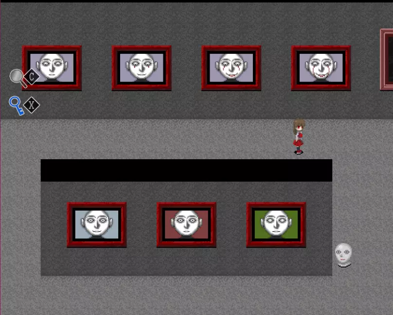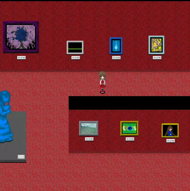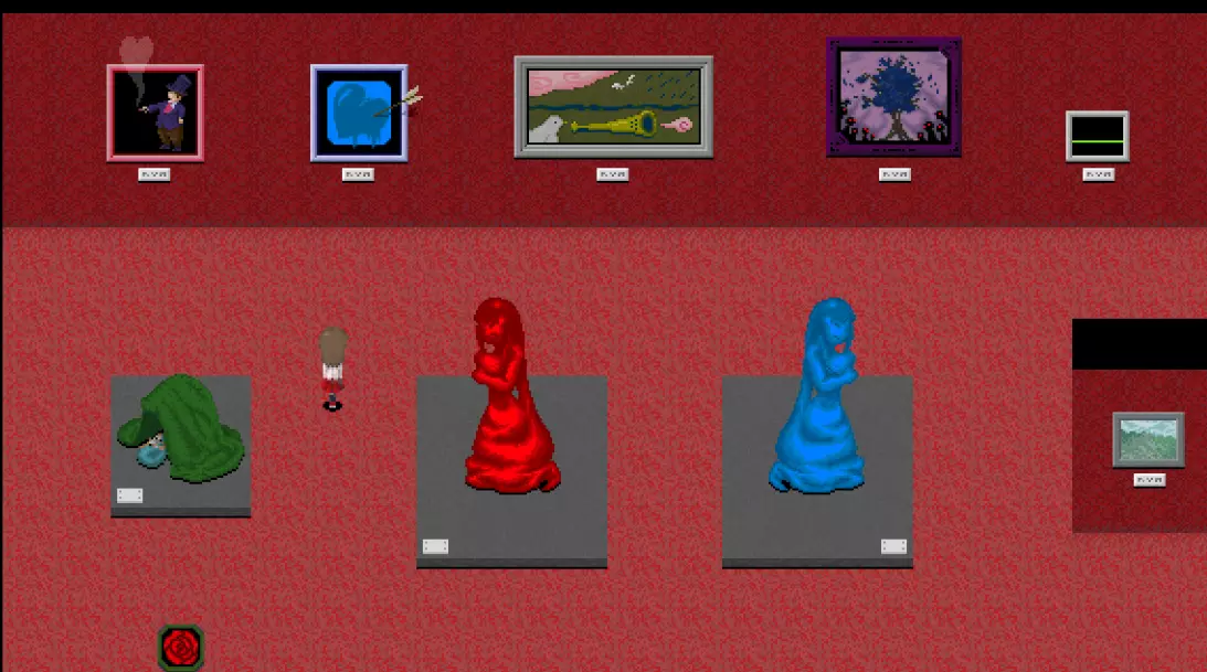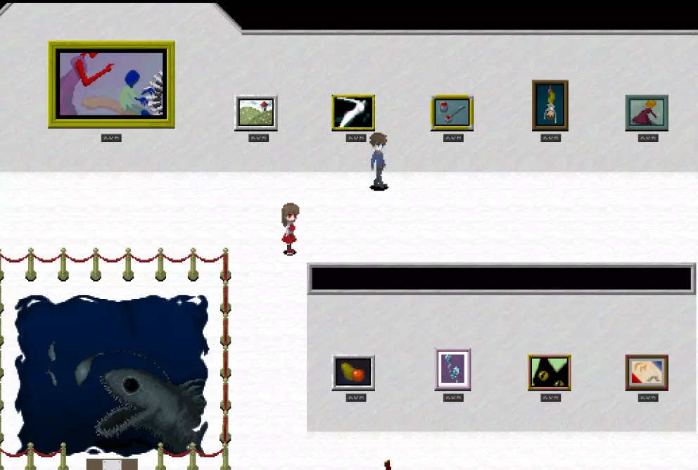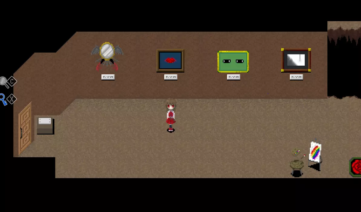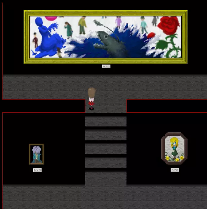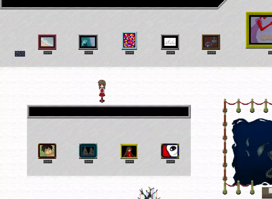【???区域】*剧透警告* 在真实展厅中有一扇白色的门,门上标有“???区域”。 ???区域内有4件作品: - 最终舞台 - 被遗忘的肖像 - 玛丽 - 虚构世界 *注:只有在游戏中见过“最终舞台”这幅作品后,才能进入这个房间。 “最终舞台”可在 bonus 地牢(青色/深渊空间、橙色等)的结尾处看到。 达成“被遗忘的肖像”结局后可获得“被遗忘的肖像”。 烧毁画布后阅读铭牌可获得“玛丽”。
