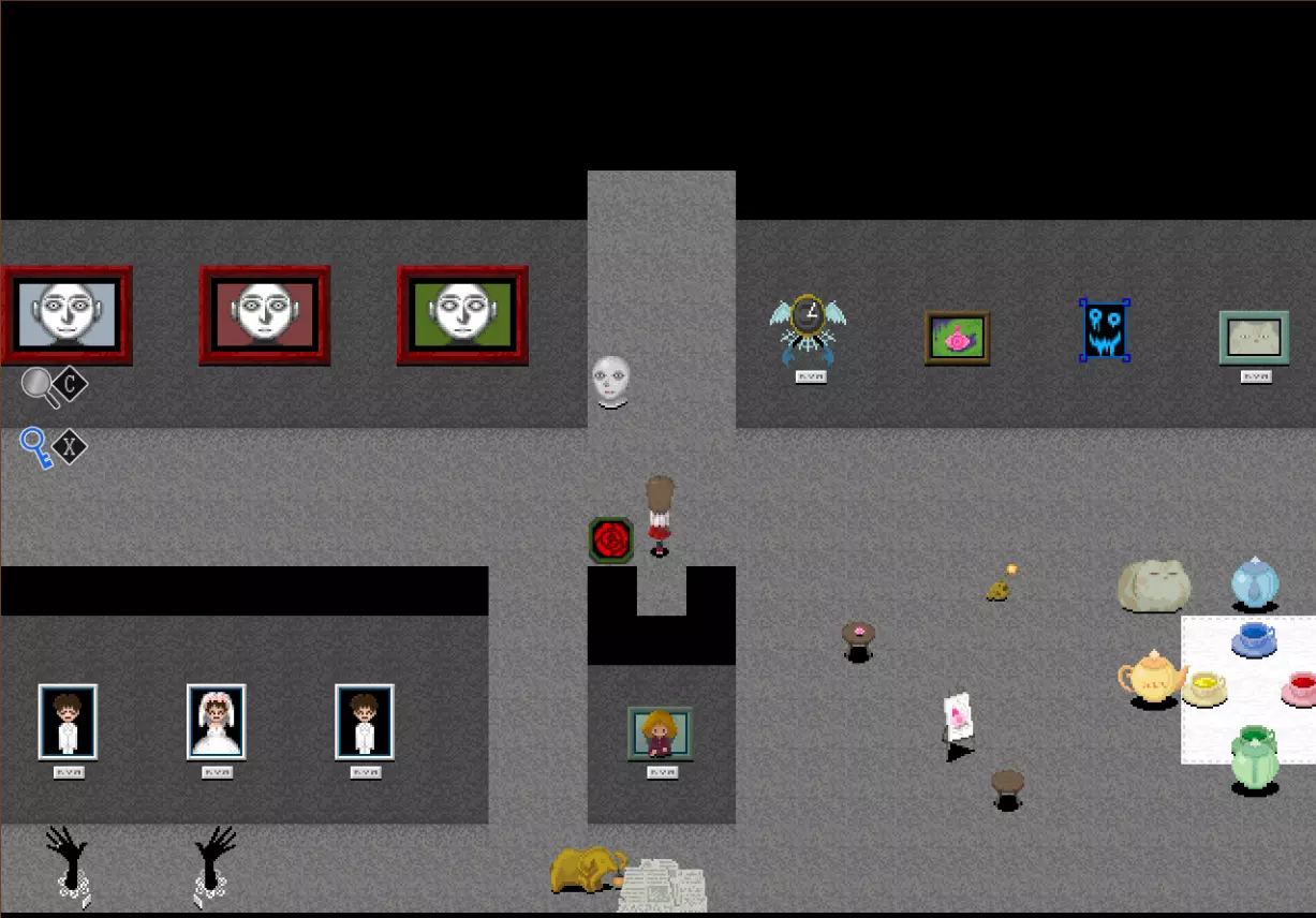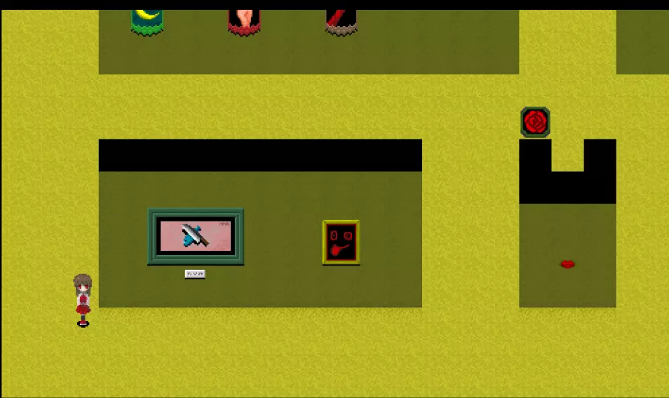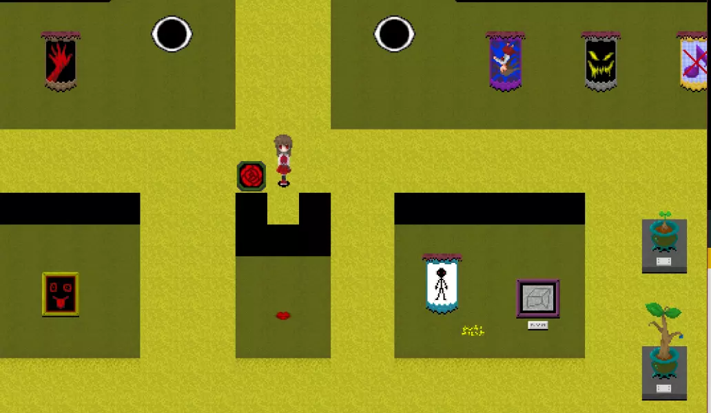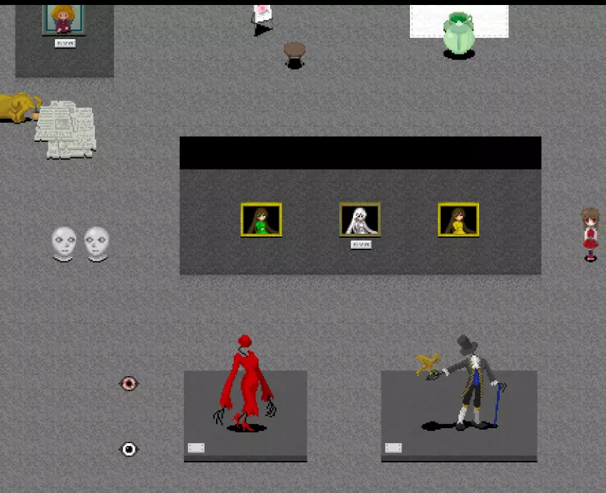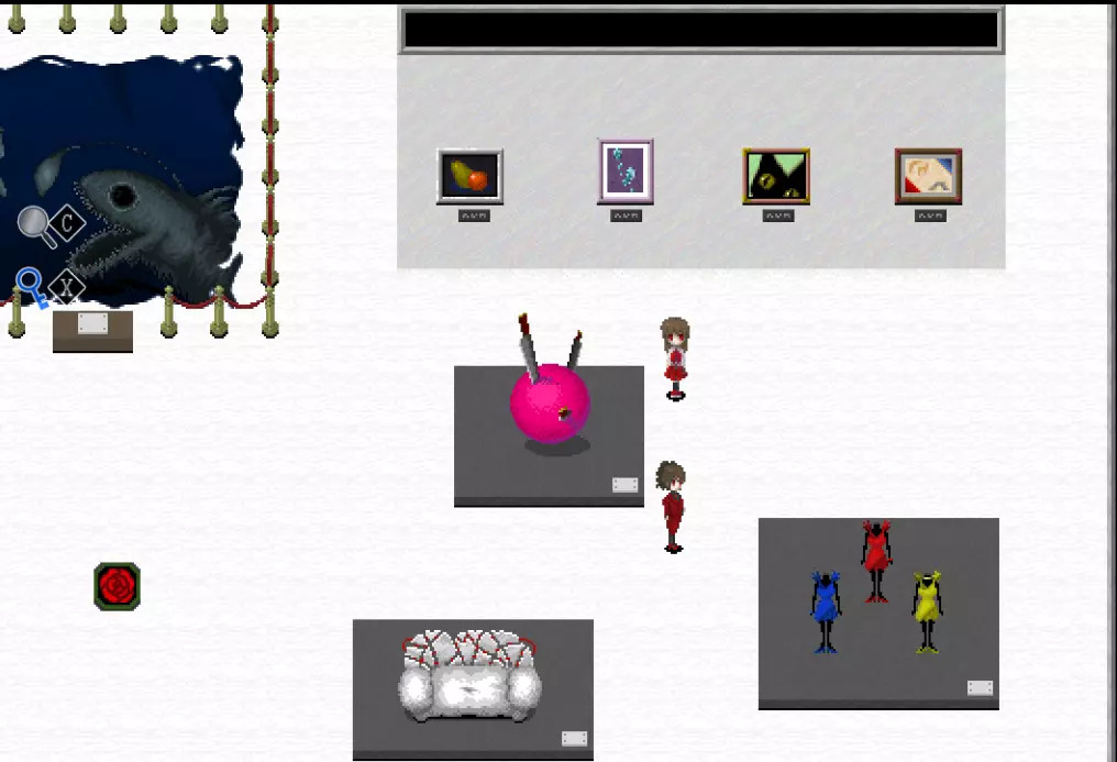 黄色区域 黄色区域有10件格尔特娜作品: - 厨师的才能 - 失衡的盒子 - 发条植物 - 红色说谎者 - 白色说谎者 - 蓝色说谎者 - 绿色说谎者 - 黄色说谎者 - 棕色诚实者 - 捉迷藏横幅 此外可见: - 艾芙的不祥横幅 - 无音乐横幅 - 怪物横幅 - 红色之手横幅 - 裸体横幅 - 月亮横幅 - 嘴巴 - 舌头摆动画作 - 石像 - 大理石人体模型 - 断头台图像 - 悬挂的玩偶 - 鱼钥匙 - 幼苗钥匙 还有凳子在房间里四处移动!