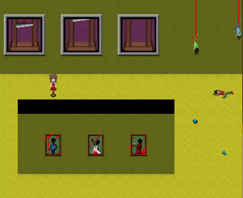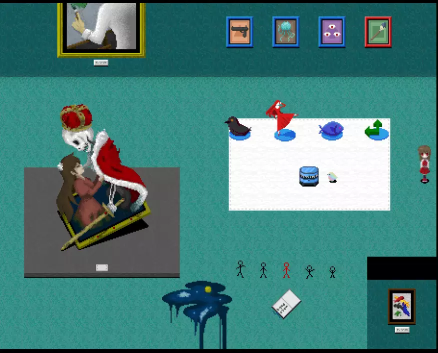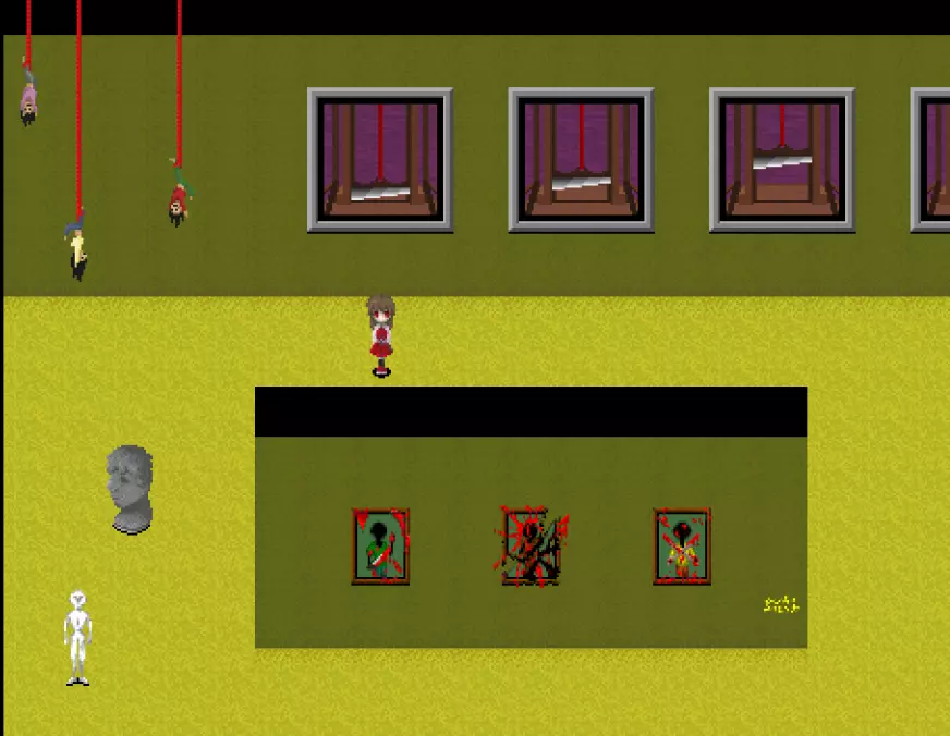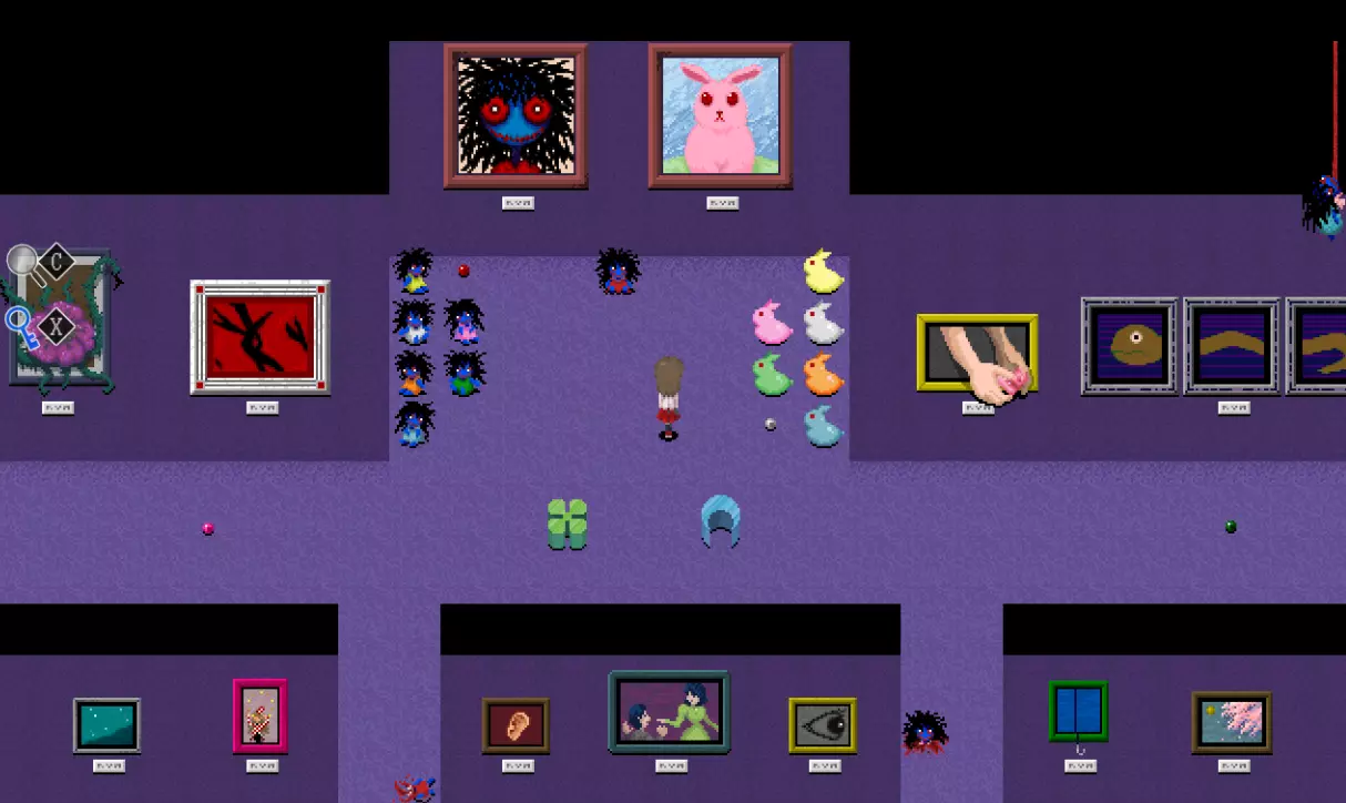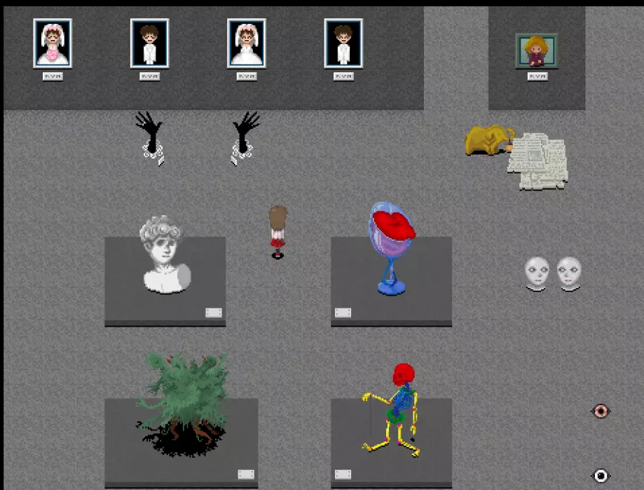 黄色区域 黄色区域有10件格尔特娜作品: - 厨师的才能 - 失衡的盒子 - 发条植物 - 红色说谎者 - 白色说谎者 - 蓝色说谎者 - 绿色说谎者 - 黄色说谎者 - 棕色诚实者 - 捉迷藏横幅 此外可见: - 艾芙的不祥横幅 - 无音乐横幅 - 怪物横幅 - 红色之手横幅 - 裸体横幅 - 月亮横幅 - 嘴巴 - 舌头摆动画作 - 石像 - 大理石人体模型 - 断头台图像 - 悬挂的玩偶 - 鱼钥匙 - 幼苗钥匙 还有凳子在房间里四处移动!