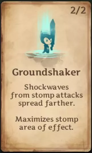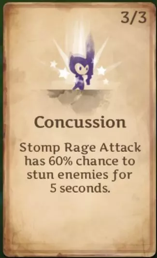 震荡冲击:使跺脚攻击有几率击晕敌人,击晕时长和触发几率随升级提升。首次升级提供22%几率击晕2秒,第二次升级提供45%几率击晕4秒,第三次即最终升级提供60%几率击晕5秒。 充能与旋风卡牌