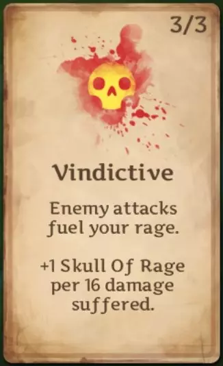 复仇:受到一定量伤害后获得一个愤怒头骨。初始状态下,每受到32点伤害获得1个头骨,之后变为每24点伤害获得1个,最终为每16点伤害获得1个。